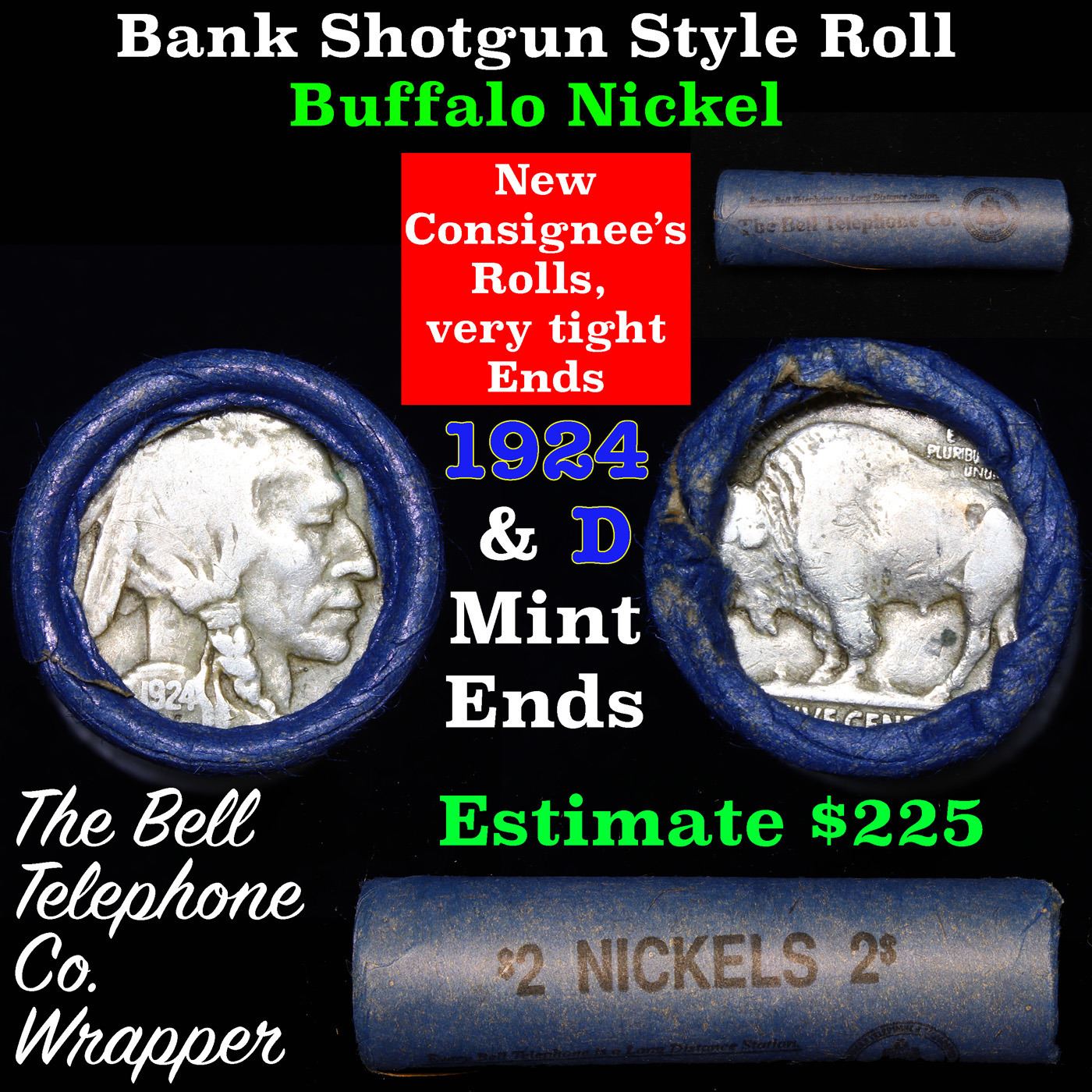 Buffalo Nickel Shotgun Roll in Old Bank Style 'Bell Telephone' Wrapper 1924 & d Mint Ends Grades. The roll is held in an old, rare "Bell Telephone" wrapper. Every Bell Telephone is a Long Distance station. They are all frrom one Estate. The ends on these rolls are very tight. We will guarantee they are all full dates.