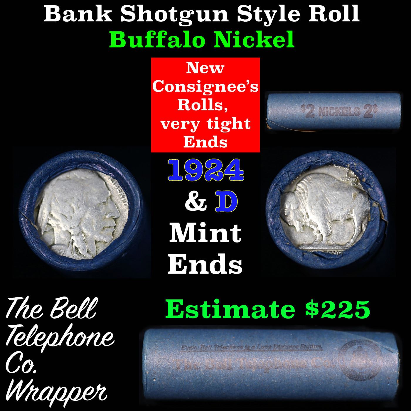 Buffalo Nickel Shotgun Roll in Old Bank Style 'Bell Telephone' Wrapper 1924 &d Mint Ends Grades. The roll is held in an old, rare "Bell Telephone Co." Bank style wrapper. This is the Bell Telephone logo from the 1960's. They are all frrom one Estate. The ends on these rolls are very tight. We will guarantee they are all full dates.