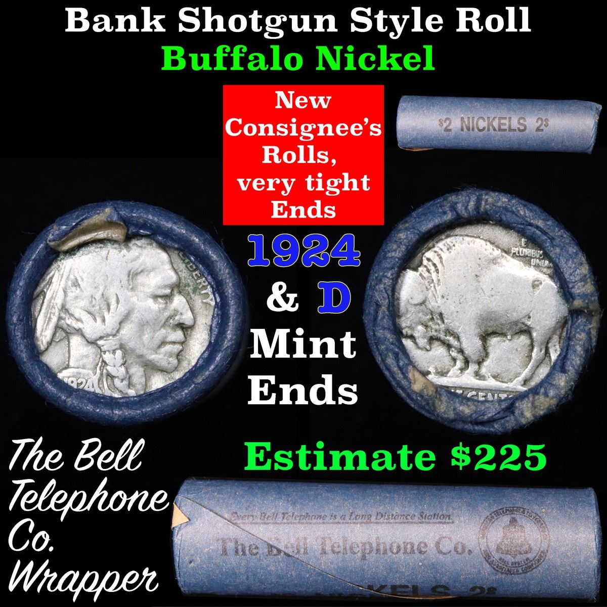 Buffalo Nickel Shotgun Roll in Old Bank Style 'Bell Telephone' Wrapper 1924 & d Mint Ends. The roll is held in an old, rare "Bell Telephone Co." Bank style wrapper. This is the Bell Telephone logo from the 1960's. They are all frrom one Estate. The ends on these rolls are very tight. We will guarantee they are all full dates.