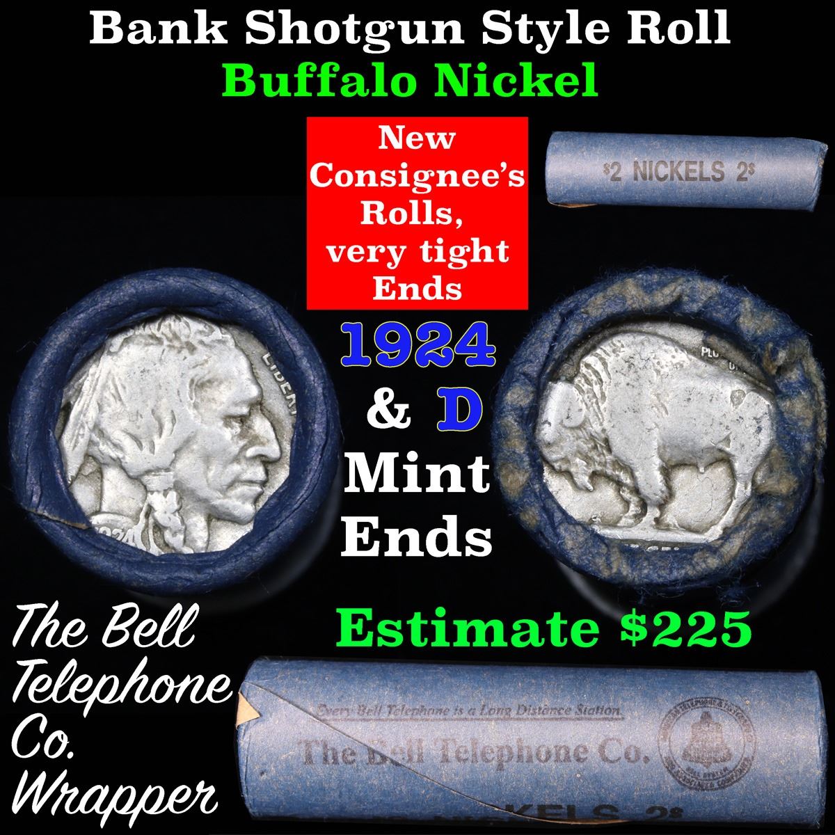 Buffalo Nickel Shotgun Roll in Old Bank Style 'Bell Telephone' Wrapper 1924& d Mint Ends. The roll is held in an old, rare "Bell Telephone Co." Bank style wrapper. This is the Bell Telephone logo from the 1960's. They are all frrom one Estate. The ends on these rolls are very tight. We will guarantee they are all full dates.
