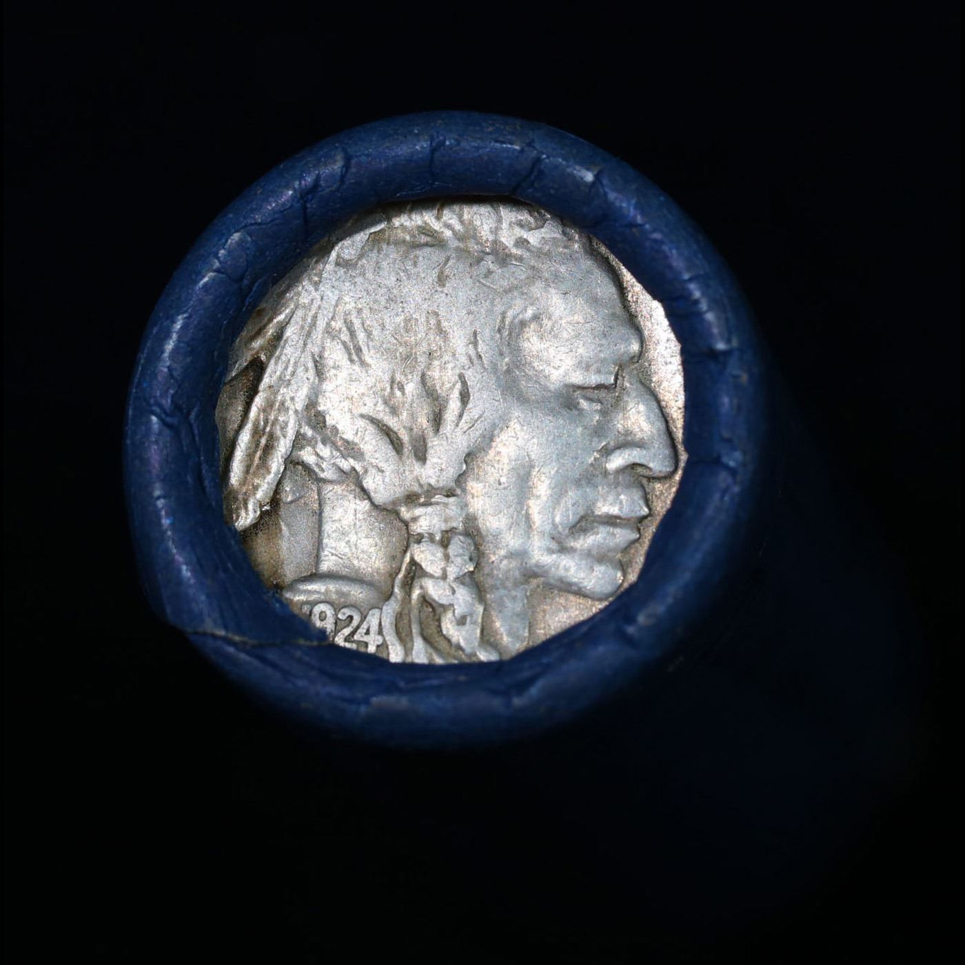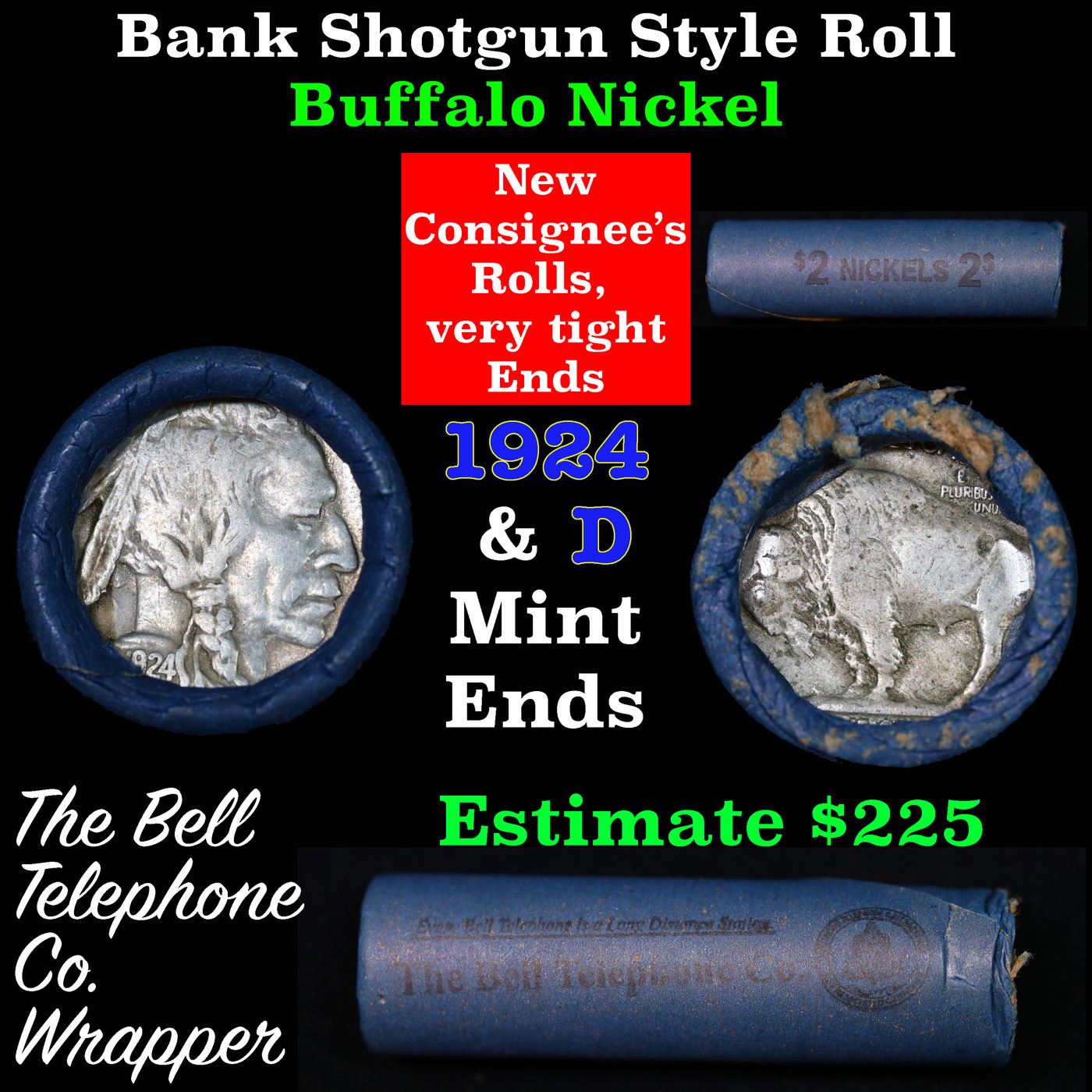 Buffalo Nickel Shotgun Roll in Old Bank Style 'Bell Telephone' Wrapper 1924& d Mint Ends. The roll is held in an old, rare "Bell Telephone Co." Bank style wrapper. This is the Bell Telephone logo from the 1960's. They are all frrom one Estate. The ends on these rolls are very tight. We will guarantee they are all full dates.