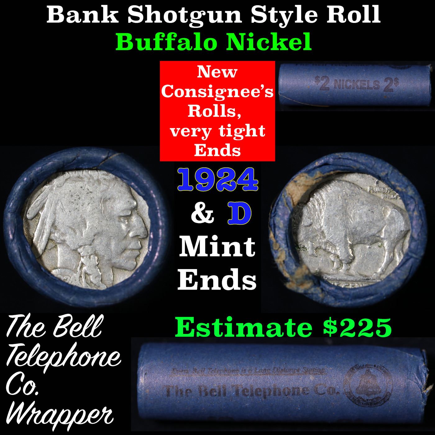 Buffalo Nickel Shotgun Roll in Old Bank Style 'Bell Telephone' Wrapper 1924& d Mint Ends. The roll is held in an old, rare "Bell Telephone Co." Bank style wrapper. This is the Bell Telephone logo from the 1960's. They are all frrom one Estate. The ends on these rolls are very tight. We will guarantee they are all full dates.