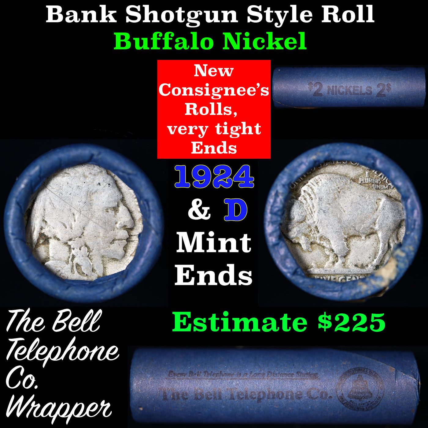 Buffalo Nickel Shotgun Roll in Old Bank Style 'Bell Telephone' Wrapper 1924 & d Mint Ends. 0 The roll is held in an old, rare "Bell Telephone Co." Bank style wrapper. This is the Bell Telephone logo from the 1960's. They are all frrom one Estate. The ends on these rolls are very tight. We will guarantee they are all full dates.
