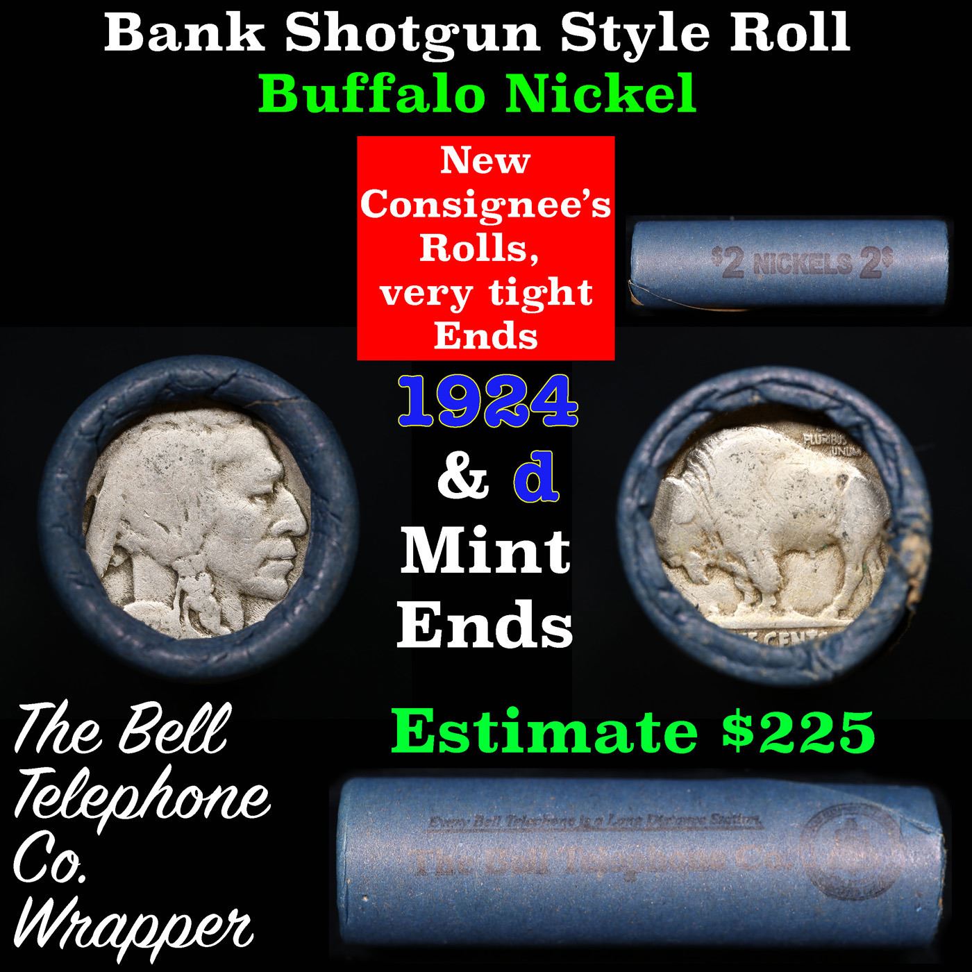 Buffalo Nickel Shotgun Roll in Old Bank Style 'Bell Telephone' Wrapper 1924 &d Mint Ends. The roll is held in an old, rare "Bell Telephone Co." Bank style wrapper. This is the Bell Telephone logo from the 1960's. They are all frrom one Estate. The ends on these rolls are very tight. We will guarantee they are all full dates.
