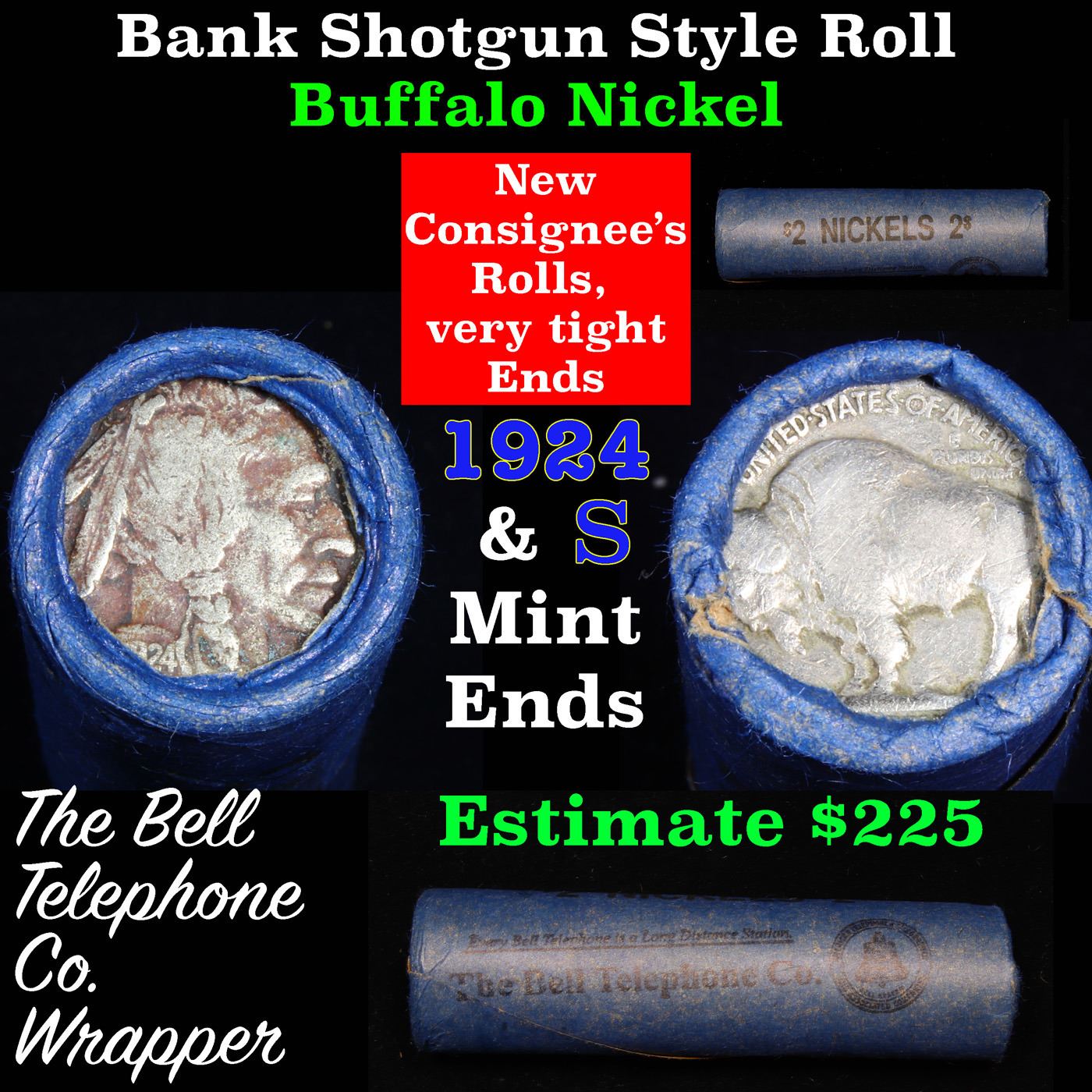 Buffalo Nickel Shotgun Roll in Old Bank Style 'Bell Telephone' Wrapper 1924 & s Mint Ends Grades. The roll is held in an old, rare "Bell Telephone" wrapper. Every Bell Telephone is a Long Distance station. They are all frrom one Estate. The ends on these rolls are very tight. We will guarantee they are all full dates.