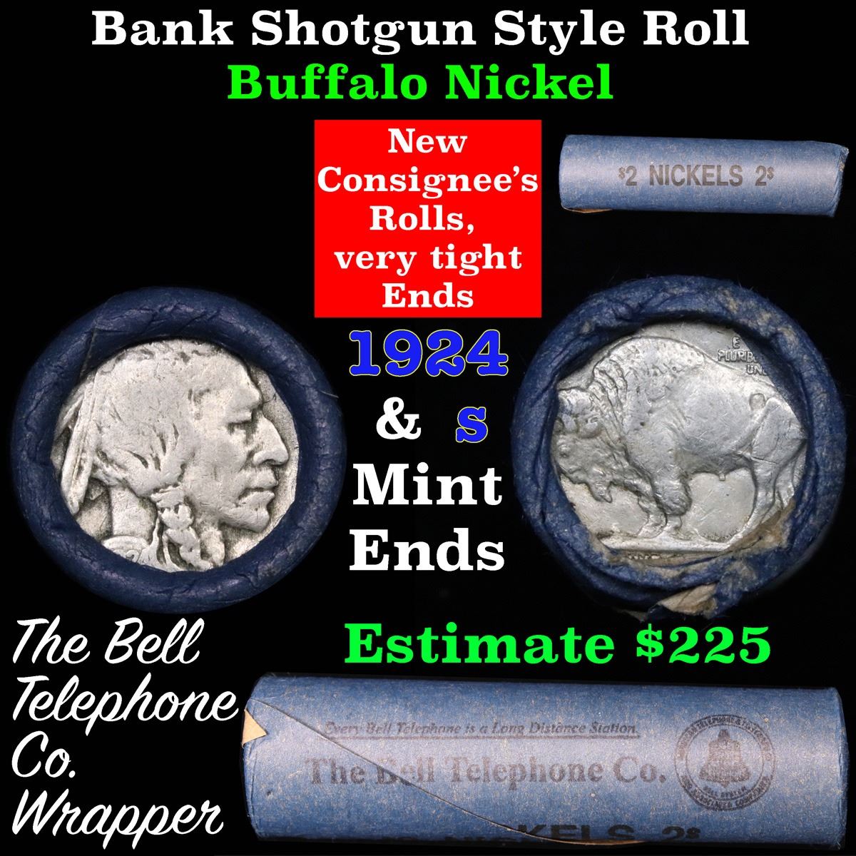 Buffalo Nickel Shotgun Roll in Old Bank Style 'Bell Telephone' Wrapper 1924 & s Mint Ends . .. The roll is held in an old, rare "Bell Telephone Co." Bank style wrapper. This is the Bell Telephone logo from the 1960's. They are all frrom one Estate. The ends on these rolls are very tight. We will guarantee they are all full dates.