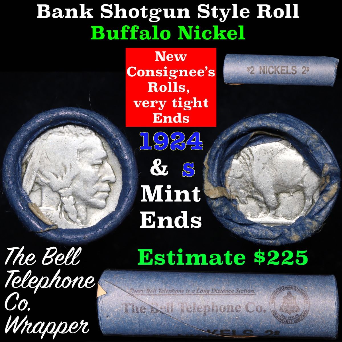 Buffalo Nickel Shotgun Roll in Old Bank Style 'Bell Telephone'  Wrapper 1924 & s Mint Ends.        The roll is held in an old, rare "Bell Telephone Co." Bank style wrapper. This is the Bell Telephone logo from the 1960's. They are all frrom one Estate. The ends on these rolls are very tight. We will guarantee they are all full dates.