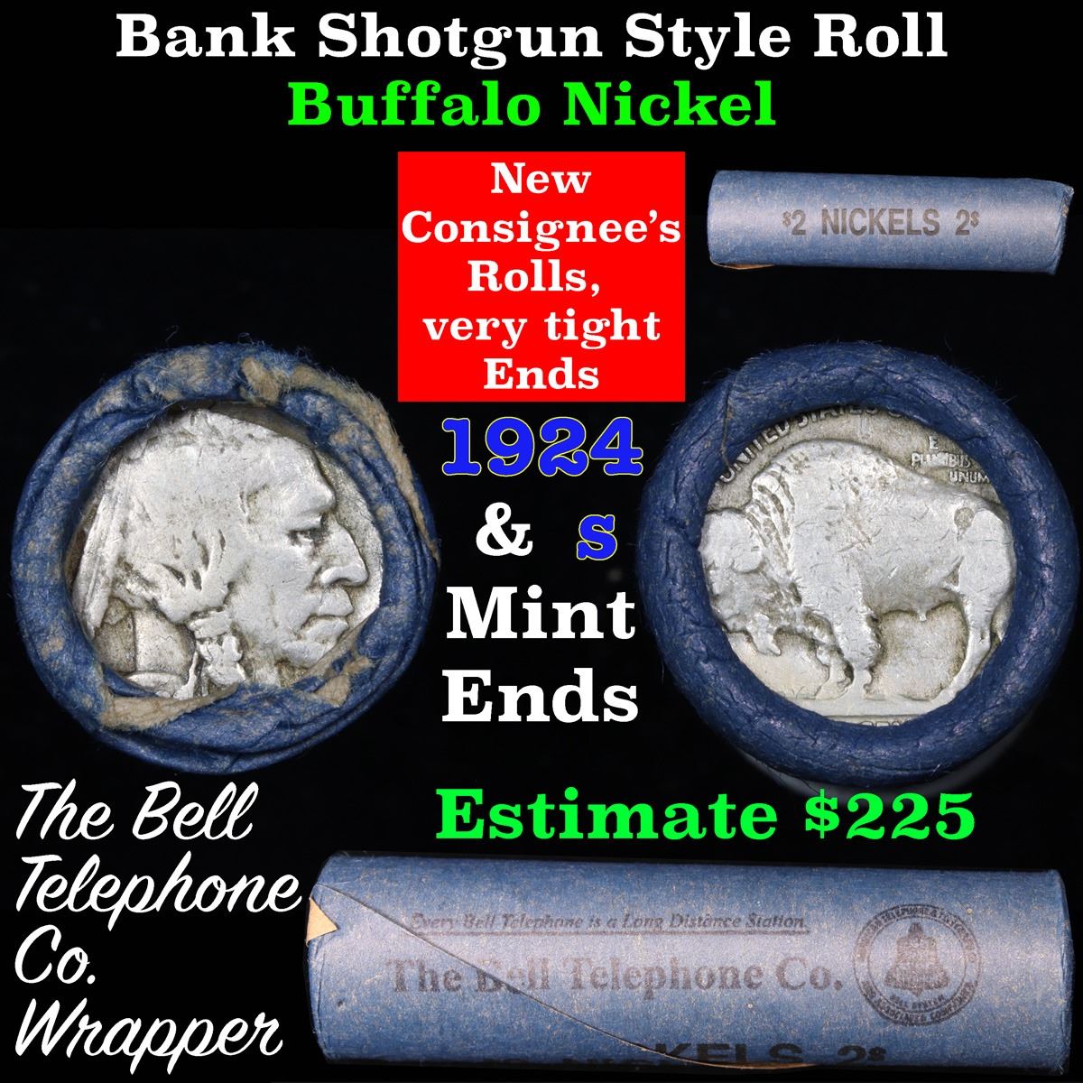 Buffalo Nickel Shotgun Roll in Old Bank Style 'Bell Telephone' Wrapper 1924 & s Mint Ends. The roll is held in an old, rare "Bell Telephone Co." Bank style wrapper. This is the Bell Telephone logo from the 1960's. They are all frrom one Estate. The ends on these rolls are very tight. We will guarantee they are all full dates.