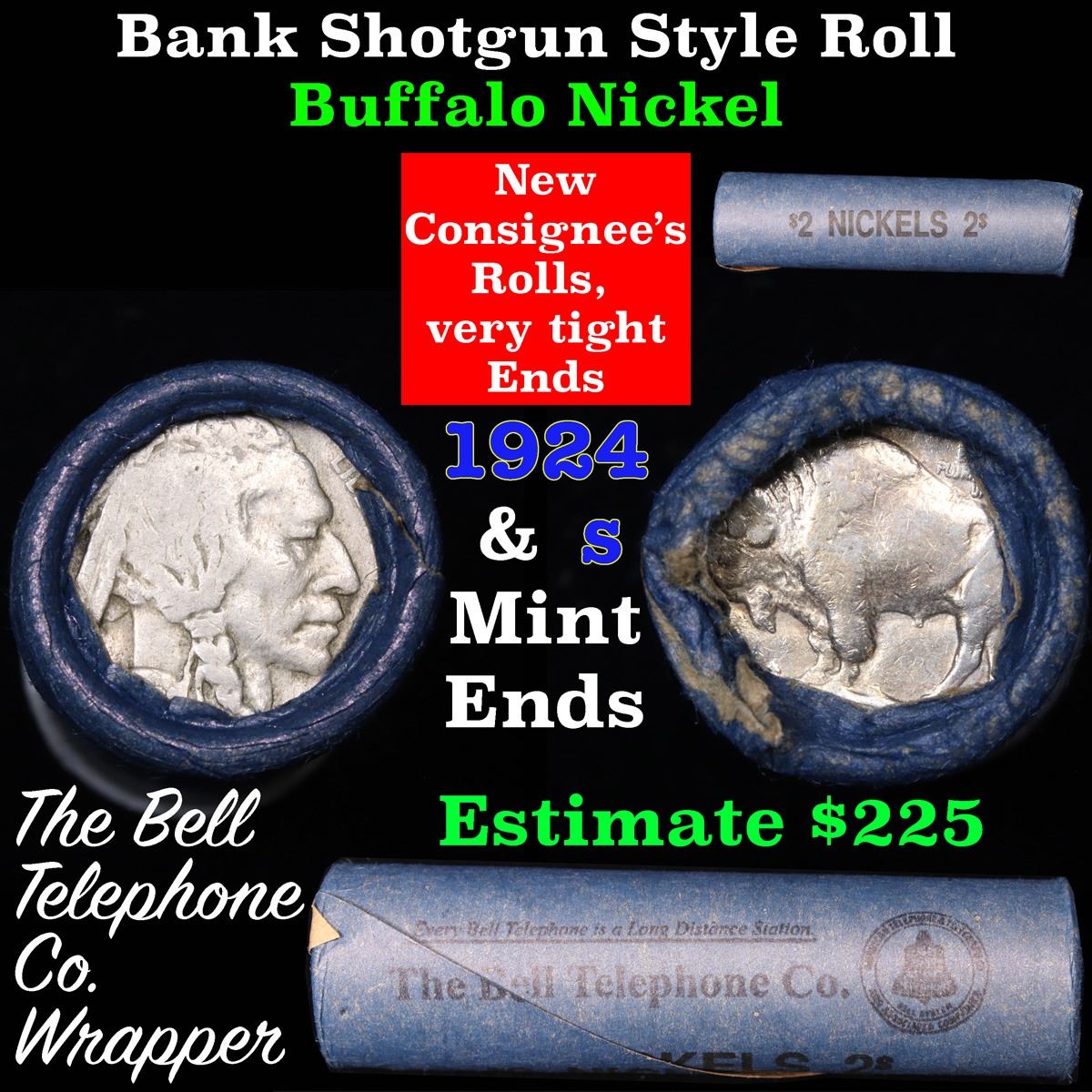 Buffalo Nickel Shotgun Roll in Old Bank Style 'Bell Telephone' Wrapper 1924 & s Mint Ends. The roll is held in an old, rare "Bell Telephone Co." Bank style wrapper. This is the Bell Telephone logo from the 1960's. They are all frrom one Estate. The ends on these rolls are very tight. We will guarantee they are all full dates.