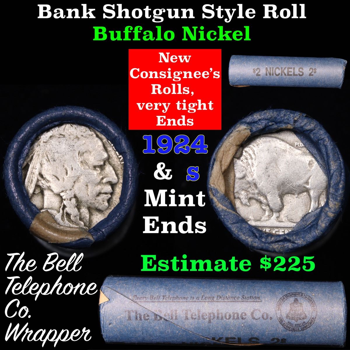 Buffalo Nickel Shotgun Roll in Old Bank Style 'Bell Telephone' Wrapper 1924 & s Mint Ends. The roll is held in an old, rare "Bell Telephone Co." Bank style wrapper. This is the Bell Telephone logo from the 1960's. They are all frrom one Estate. The ends on these rolls are very tight. We will guarantee they are all full dates.