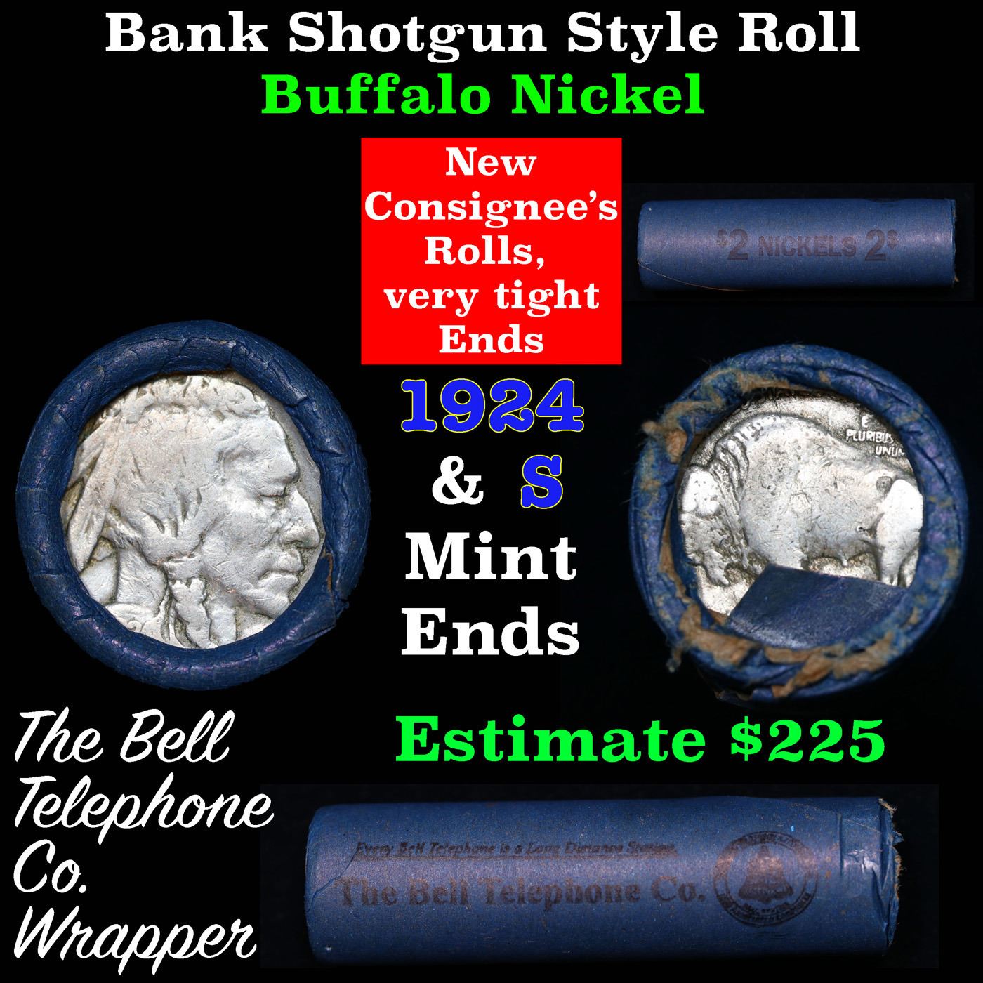 Buffalo Nickel Shotgun Roll in Old Bank Style 'Bell Telephone' Wrapper 1924& s Mint Ends. The roll is held in an old, rare "Bell Telephone Co." Bank style wrapper. This is the Bell Telephone logo from the 1960's. They are all frrom one Estate. The ends on these rolls are very tight. We will guarantee they are all full dates.