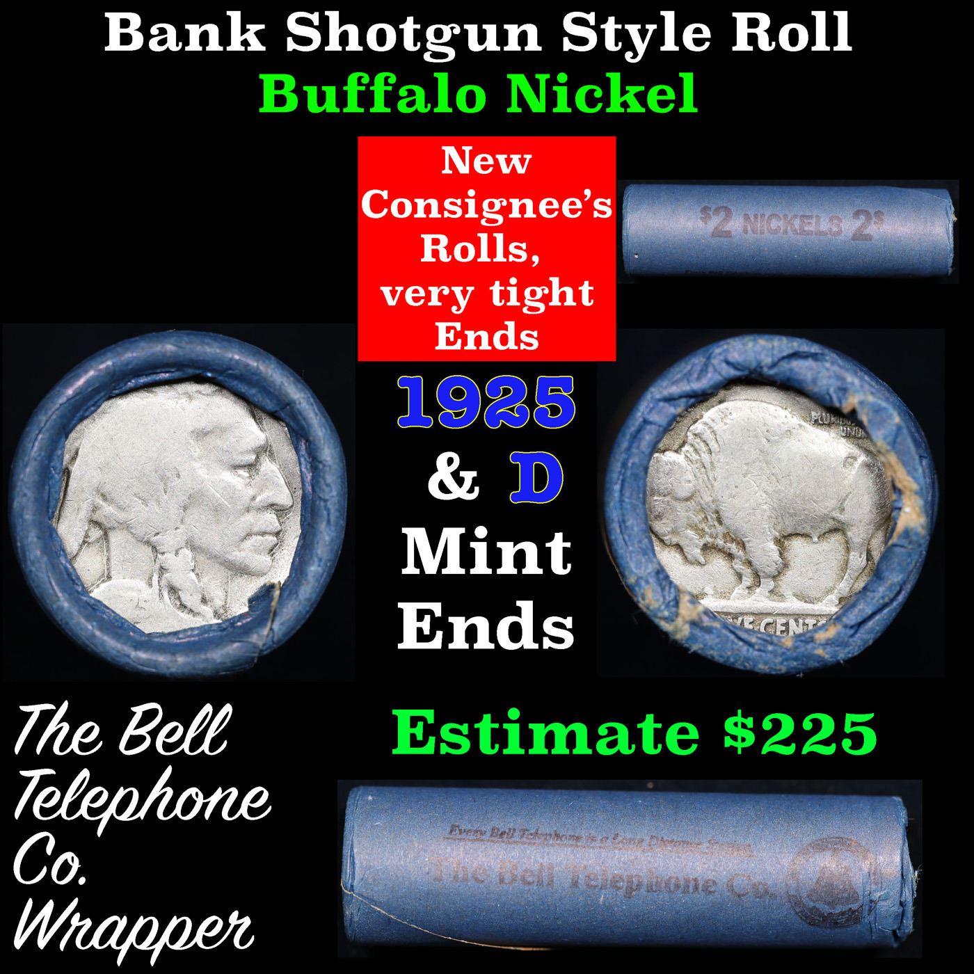 Buffalo Nickel Shotgun Roll in Old Bank Style 'Bell Telephone' Wrapper 1925 & D Mint Ends. The roll is held in an old, rare "Bell Telephone Co." Bank style wrapper. This is the Bell Telephone logo from the 1960's. They are all frrom one Estate. The ends on these rolls are very tight. We will guarantee they are all full dates.