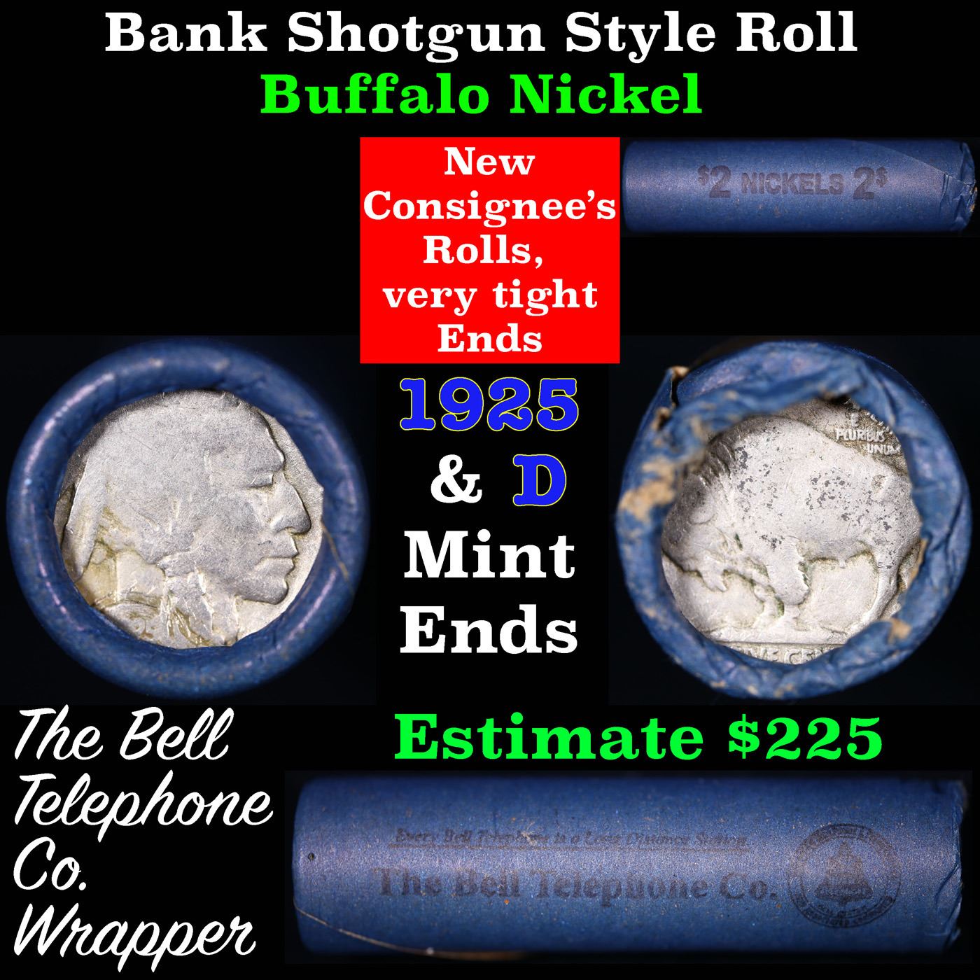 Buffalo Nickel Shotgun Roll in Old Bank Style 'Bell Telephone' Wrapper 1925 & D Mint Ends. The roll is held in an old, rare "Bell Telephone Co." Bank style wrapper. This is the Bell Telephone logo from the 1960's. They are all frrom one Estate. The ends on these rolls are very tight. We will guarantee they are all full dates.