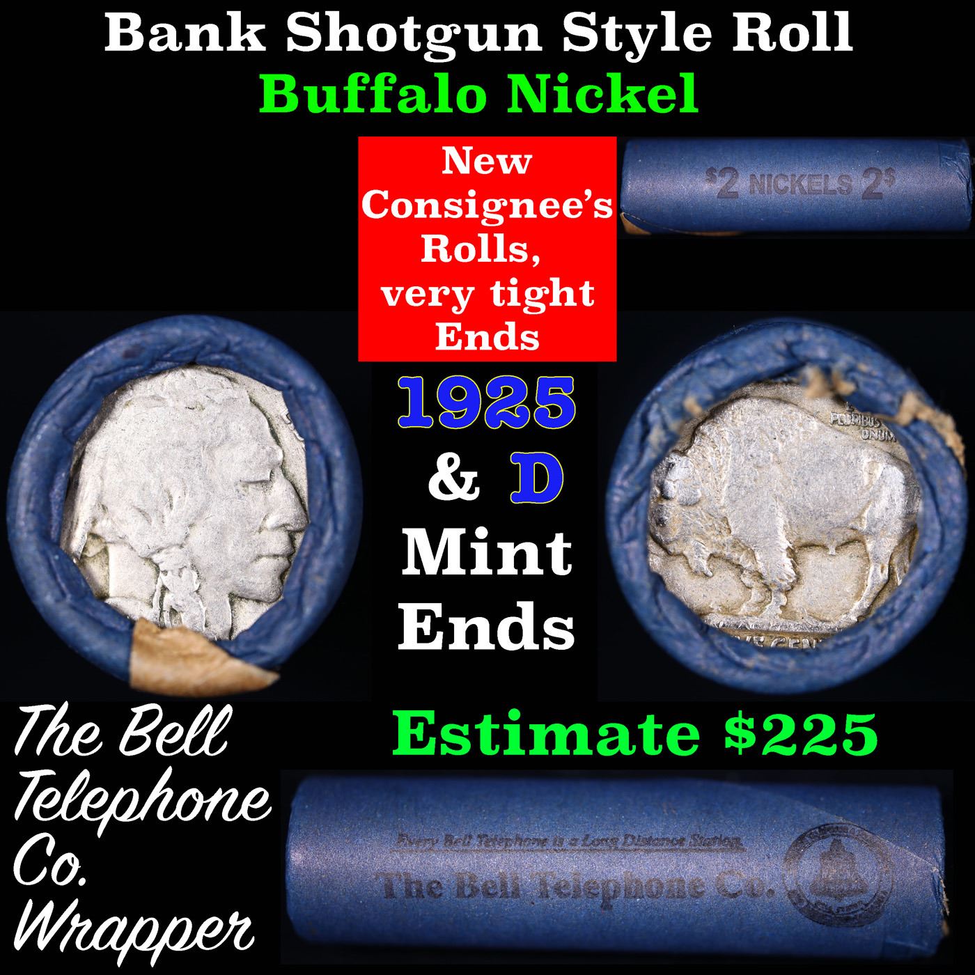Buffalo Nickel Shotgun Roll in Old Bank Style 'Bell Telephone' Wrapper 1925 & D Mint Ends. The roll is held in an old, rare "Bell Telephone Co." Bank style wrapper. This is the Bell Telephone logo from the 1960's. They are all frrom one Estate. The ends on these rolls are very tight. We will guarantee they are all full dates.