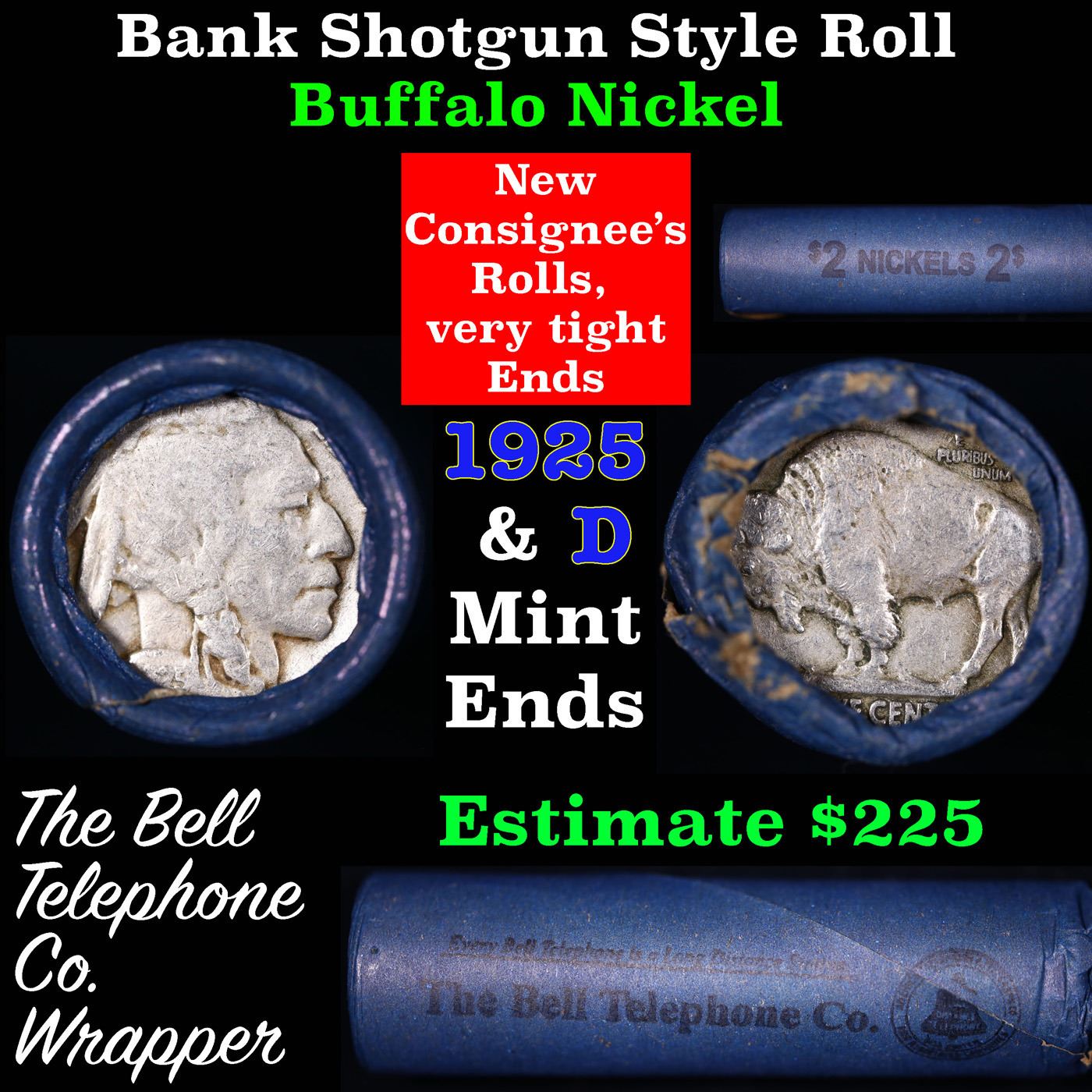Buffalo Nickel Shotgun Roll in Old Bank Style 'Bell Telephone' Wrapper 1925 & D Mint Ends. The roll is held in an old, rare "Bell Telephone Co." Bank style wrapper. This is the Bell Telephone logo from the 1960's. They are all frrom one Estate. The ends on these rolls are very tight. We will guarantee they are all full dates.