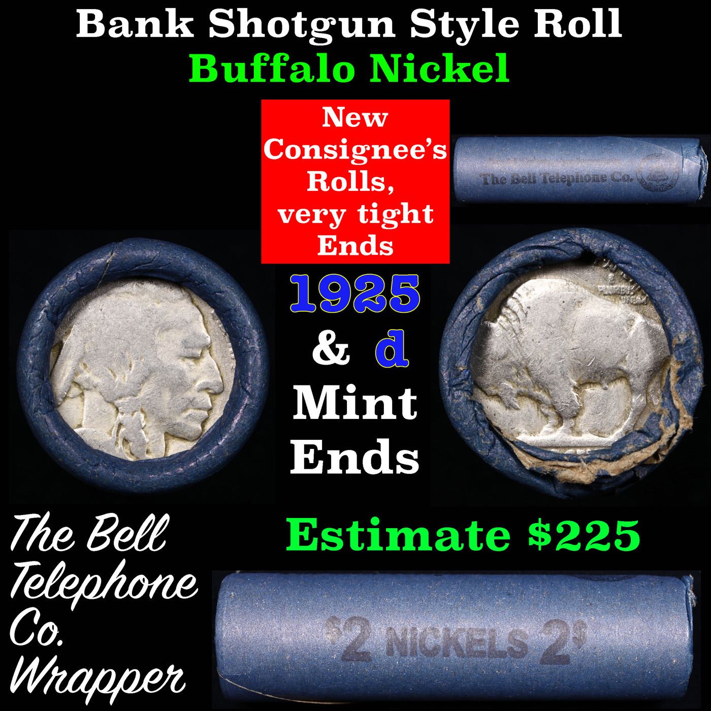 Buffalo Nickel Shotgun Roll in Old Bank Style 'Bell Telephone' Wrapper 1925 & D Mint Ends. The roll is held in an old, rare "Bell Telephone Co." Bank style wrapper. This is the Bell Telephone logo from the 1960's. They are all frrom one Estate. The ends on these rolls are very tight. We will guarantee they are all full dates.