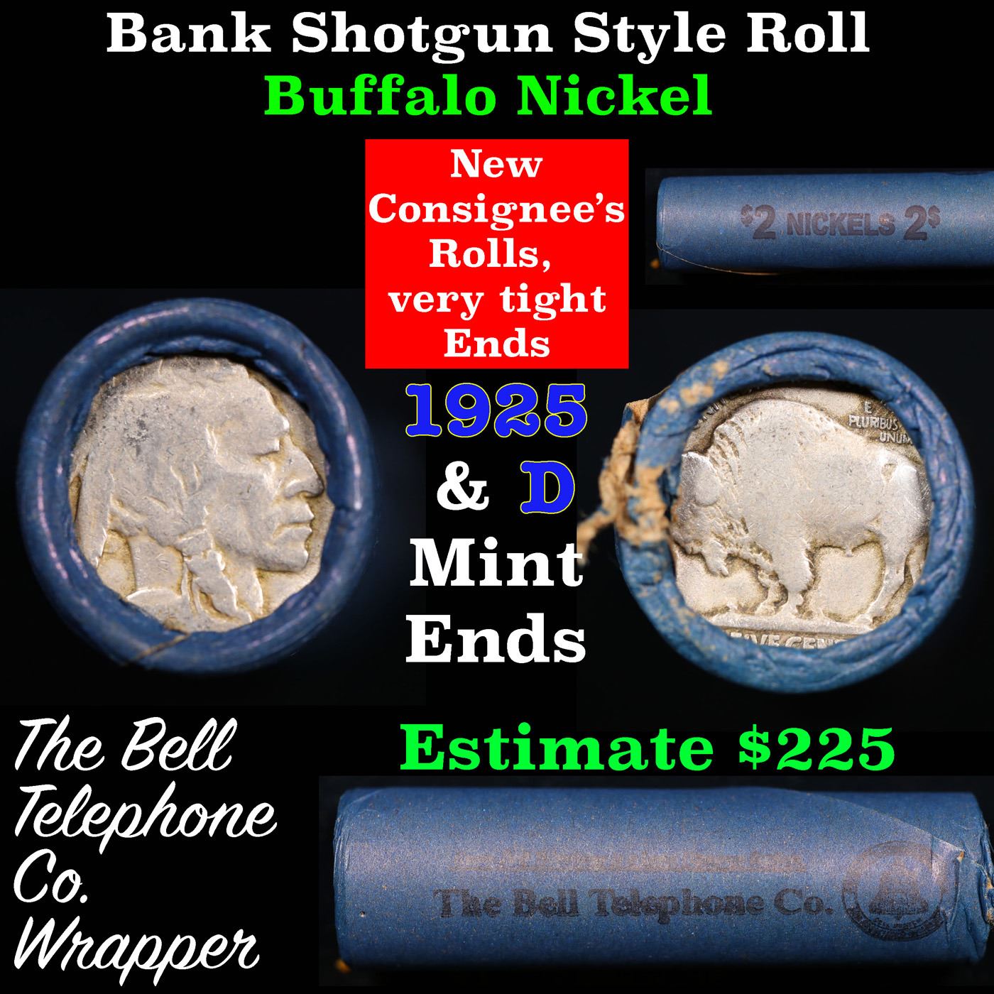 Buffalo Nickel Shotgun Roll in Old Bank Style 'Bell Telephone' Wrapper 1925 & D Mint Ends. The roll is held in an old, rare "Bell Telephone Co." Bank style wrapper. This is the Bell Telephone logo from the 1960's. They are all frrom one Estate. The ends on these rolls are very tight. We will guarantee they are all full dates.