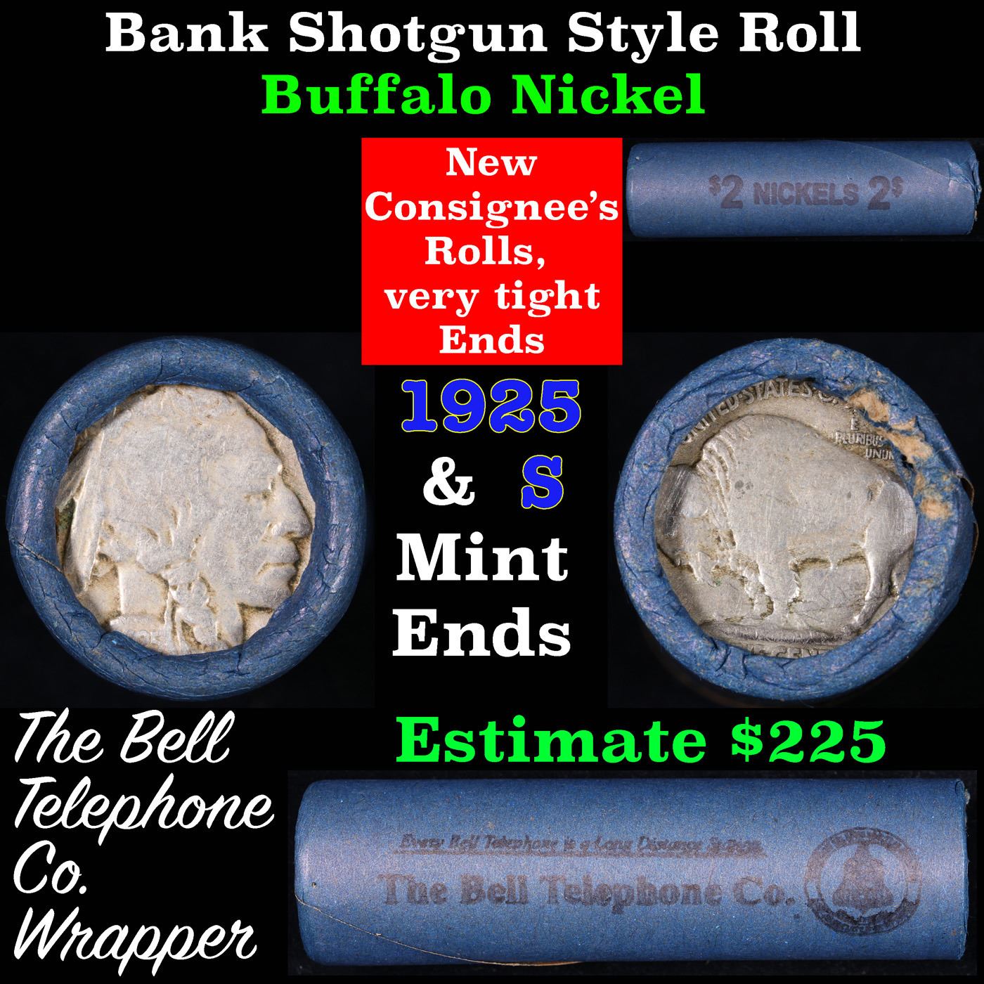 Buffalo Nickel Shotgun Roll in Old Bank Style 'Bell Telephone' Wrapper 1925 & S Mint Ends. The roll is held in an old, rare "Bell Telephone Co." Bank style wrapper. This is the Bell Telephone logo from the 1960's. They are all frrom one Estate. The ends on these rolls are very tight. We will guarantee they are all full dates.