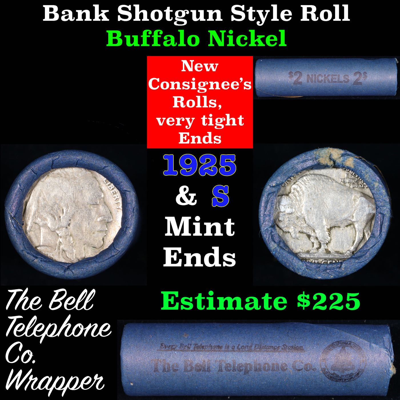 Buffalo Nickel Shotgun Roll in Old Bank Style 'Bell Telephone' Wrapper 1925 & S Mint Ends. The roll is held in an old, rare "Bell Telephone Co." Bank style wrapper. This is the Bell Telephone logo from the 1960's. They are all frrom one Estate. The ends on these rolls are very tight. We will guarantee they are all full dates.