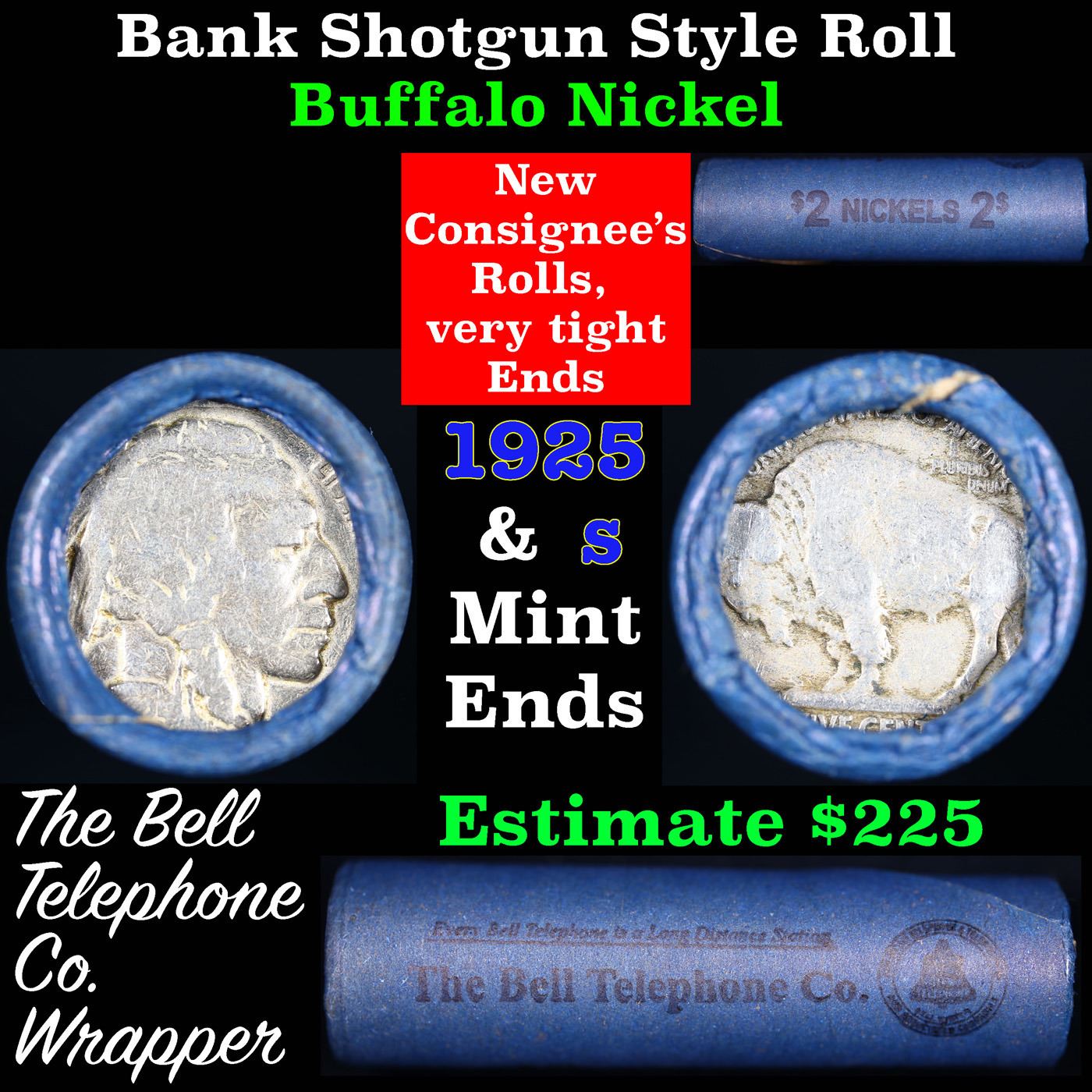 Buffalo Nickel Shotgun Roll in Old Bank Style 'Bell Telephone' Wrapper 1925 & S Mint Ends. The roll is held in an old, rare "Bell Telephone Co." Bank style wrapper. This is the Bell Telephone logo from the 1960's. They are all frrom one Estate. The ends on these rolls are very tight. We will guarantee they are all full dates.