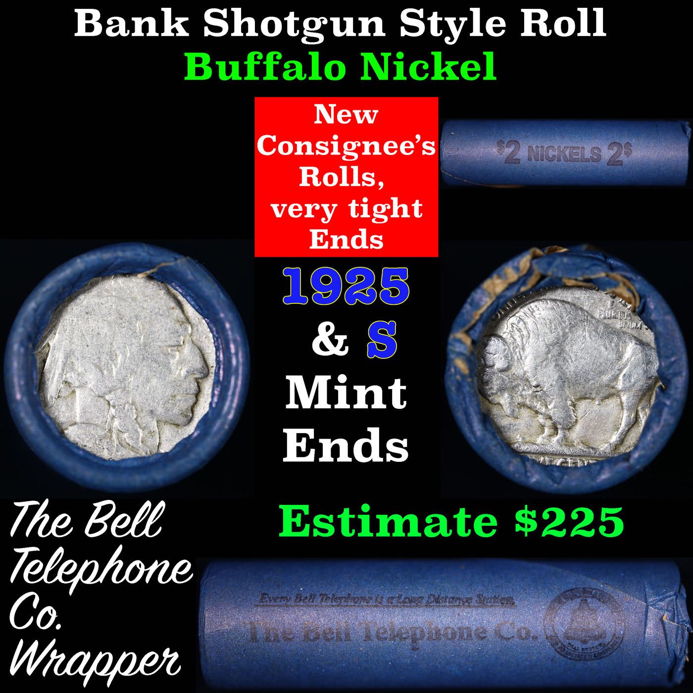 Buffalo Nickel Shotgun Roll in Old Bank Style 'Bell Telephone' Wrapper 1925 & S Mint Ends. The roll is held in an old, rare "Bell Telephone Co." Bank style wrapper. This is the Bell Telephone logo from the 1960's. They are all frrom one Estate. The ends on these rolls are very tight. We will guarantee they are all full dates.