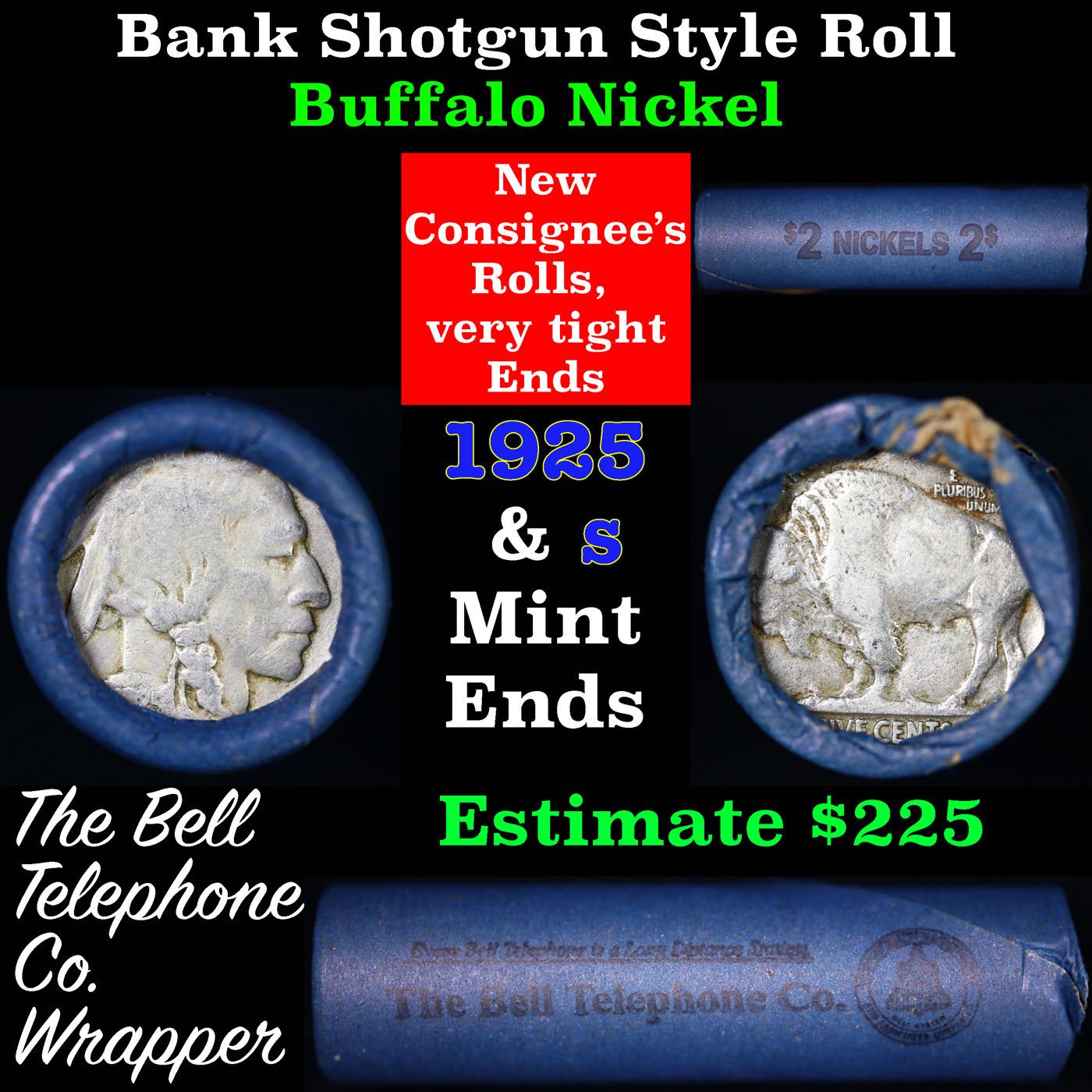 Buffalo Nickel Shotgun Roll in Old Bank Style 'Bell Telephone' Wrapper 1925 & S Mint Ends. The roll is held in an old, rare "Bell Telephone Co." Bank style wrapper. This is the Bell Telephone logo from the 1960's. They are all frrom one Estate. The ends on these rolls are very tight. We will guarantee they are all full dates.