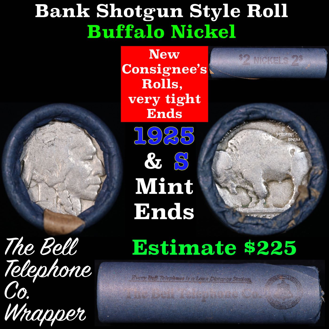 Buffalo Nickel Shotgun Roll in Old Bank Style 'Bell Telephone' Wrapper 1925 & S Mint Ends. The roll is held in an old, rare "Bell Telephone Co." Bank style wrapper. This is the Bell Telephone logo from the 1960's. They are all frrom one Estate. The ends on these rolls are very tight. We will guarantee they are all full dates.