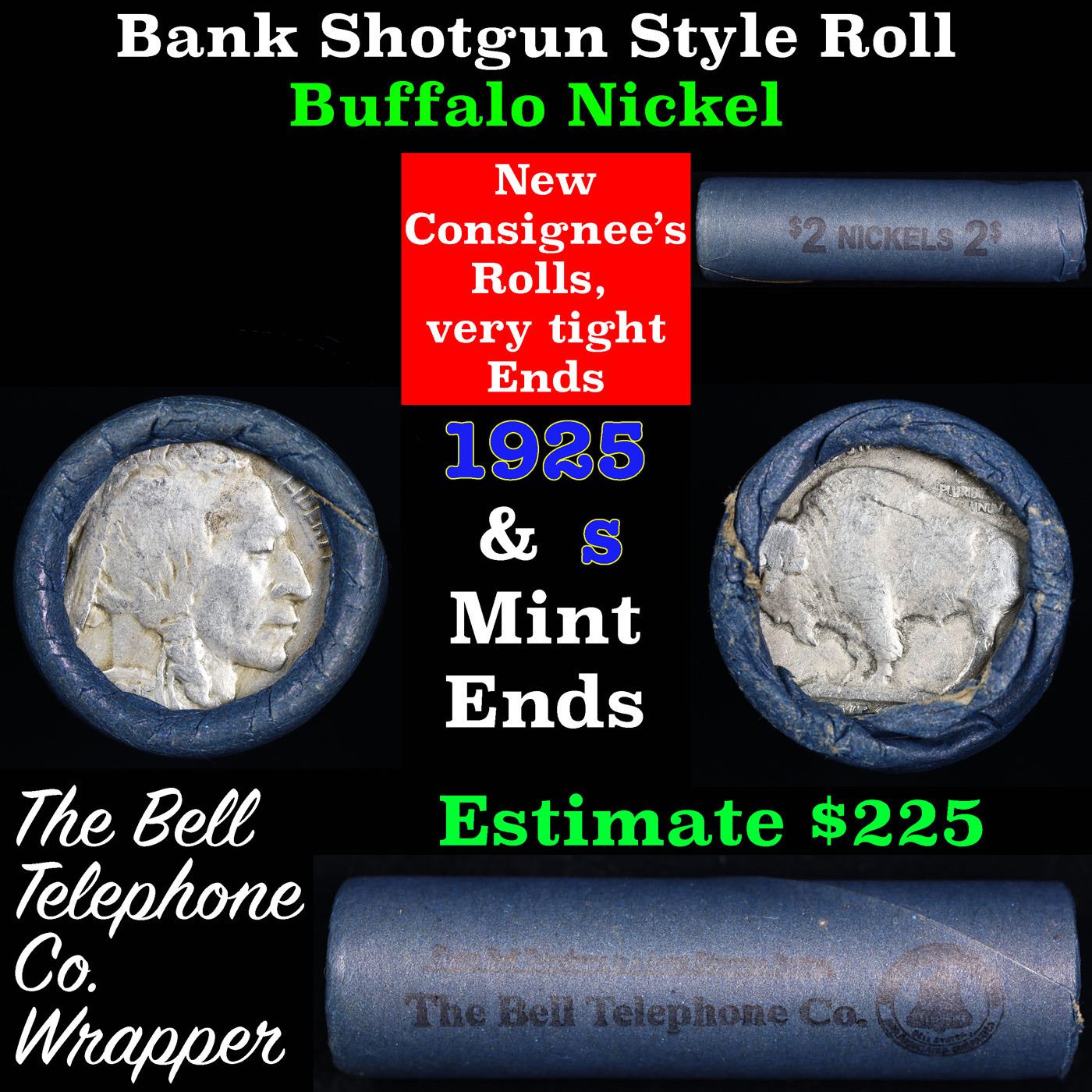 Buffalo Nickel Shotgun Roll in Old Bank Style 'Bell Telephone' Wrapper 1925 & S Mint Ends. The roll is held in an old, rare "Bell Telephone Co." Bank style wrapper. This is the Bell Telephone logo from the 1960's. They are all frrom one Estate. The ends on these rolls are very tight. We will guarantee they are all full dates.