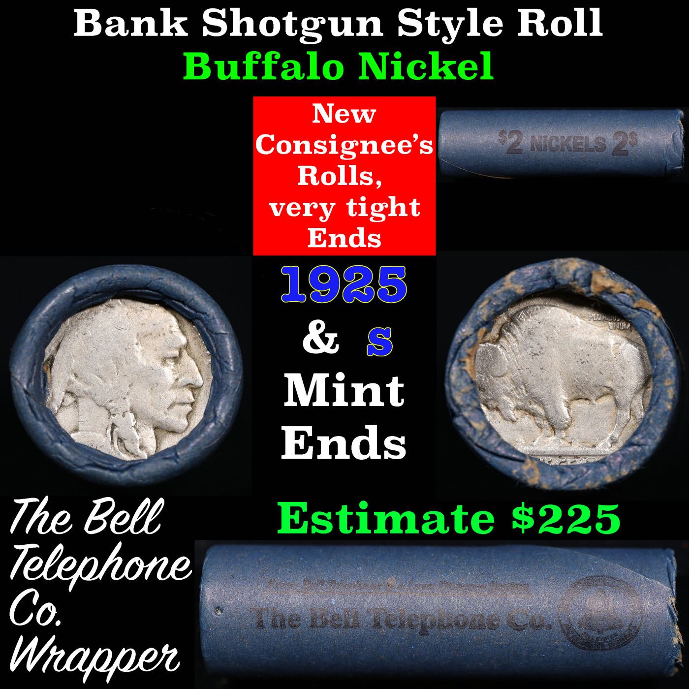 Buffalo Nickel Shotgun Roll in Old Bank Style 'Bell Telephone' Wrapper 1925 & S Mint Ends. The roll is held in an old, rare "Bell Telephone Co." Bank style wrapper. This is the Bell Telephone logo from the 1960's. They are all frrom one Estate. The ends on these rolls are very tight. We will guarantee they are all full dates.