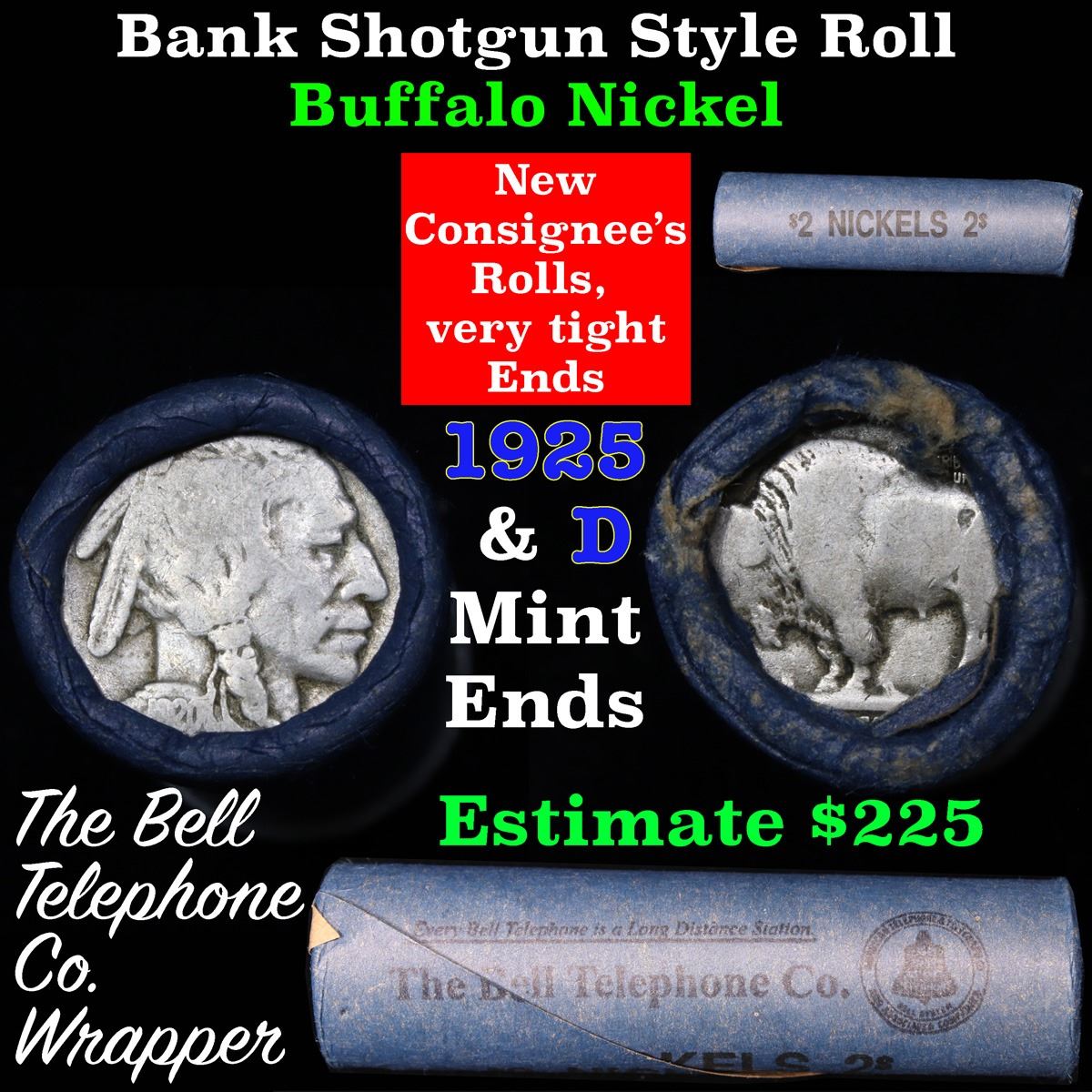 Buffalo Nickel Shotgun Roll in Old Bank Style 'Bell Telephone' Wrapper 1925 & d Mint Ends. The roll is held in an old, rare "Bell Telephone Co." Bank style wrapper. This is the Bell Telephone logo from the 1960's. They are all frrom one Estate. The ends on these rolls are very tight. We will guarantee they are all full dates.