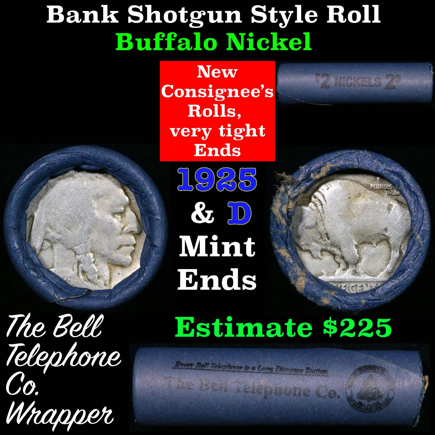 Buffalo Nickel Shotgun Roll in Old Bank Style 'Bell Telephone' Wrapper 1925 & d Mint Ends. The roll is held in an old, rare "Bell Telephone Co." Bank style wrapper. This is the Bell Telephone logo from the 1960's. They are all frrom one Estate. The ends on these rolls are very tight. We will guarantee they are all full dates.