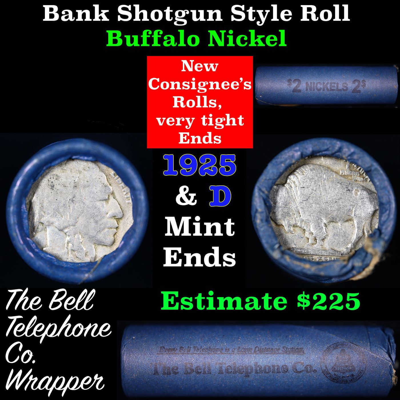 Buffalo Nickel Shotgun Roll in Old Bank Style 'Bell Telephone' Wrapper 1925 &d Mint Ends