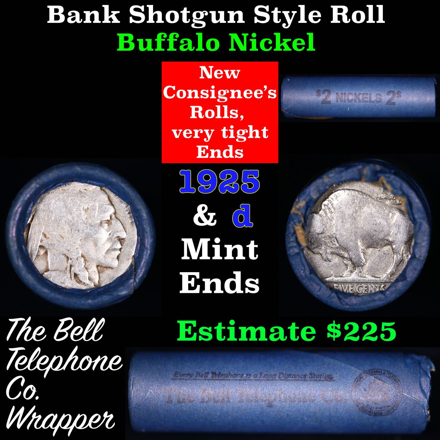 Buffalo Nickel Shotgun Roll in Old Bank Style 'Bell Telephone' Wrapper 1925 &d Mint Ends. The roll is held in an old, rare "Bell Telephone Co." Bank style wrapper. This is the Bell Telephone logo from the 1960's. They are all frrom one Estate. The ends on these rolls are very tight. We will guarantee they are all full dates.