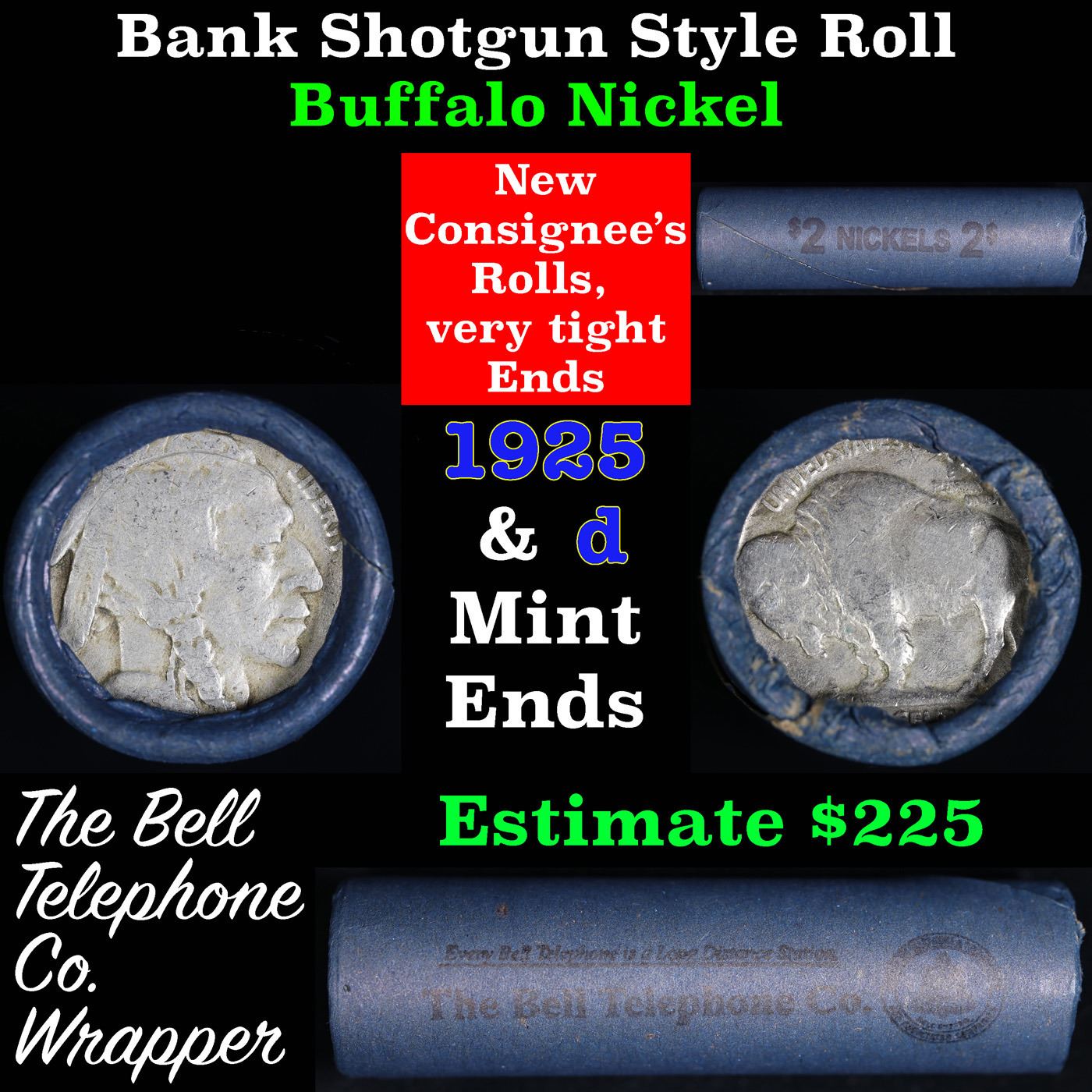 Buffalo Nickel Shotgun Roll in Old Bank Style 'Bell Telephone' Wrapper 1925 &d Mint Ends. The roll is held in an old, rare "Bell Telephone Co." Bank style wrapper. This is the Bell Telephone logo from the 1960's. They are all frrom one Estate. The ends on these rolls are very tight. We will guarantee they are all full dates.
