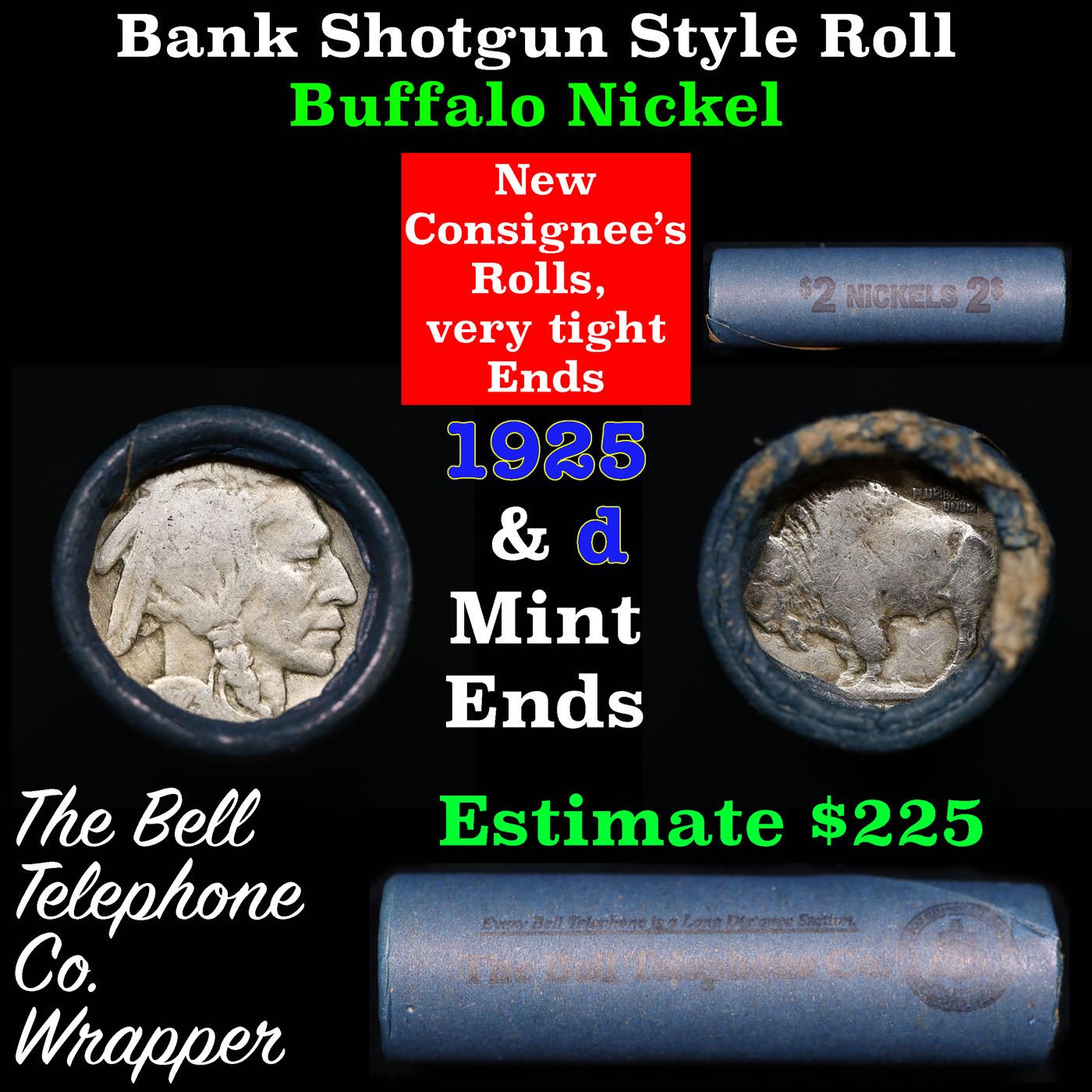 Buffalo Nickel Shotgun Roll in Old Bank Style 'Bell Telephone' Wrapper 1925 &d Mint Ends. The roll is held in an old, rare "Bell Telephone Co." Bank style wrapper. This is the Bell Telephone logo from the 1960's. They are all frrom one Estate. The ends on these rolls are very tight. We will guarantee they are all full dates.