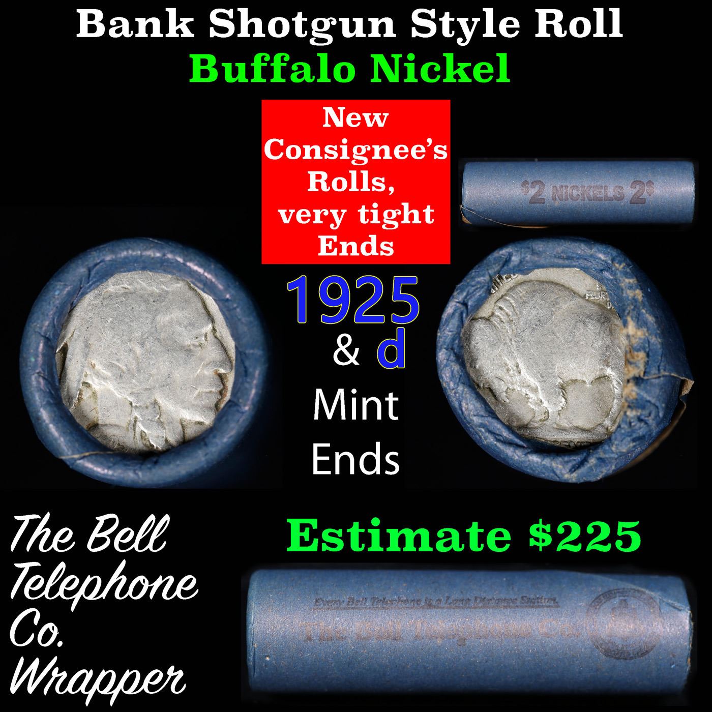 Buffalo Nickel Shotgun Roll in Old Bank Style 'Bell Telephone' Wrapper 1925 &d Mint Ends. The roll is held in an old, rare "Bell Telephone Co." Bank style wrapper. This is the Bell Telephone logo from the 1960's. They are all frrom one Estate. The ends on these rolls are very tight. We will guarantee they are all full dates.