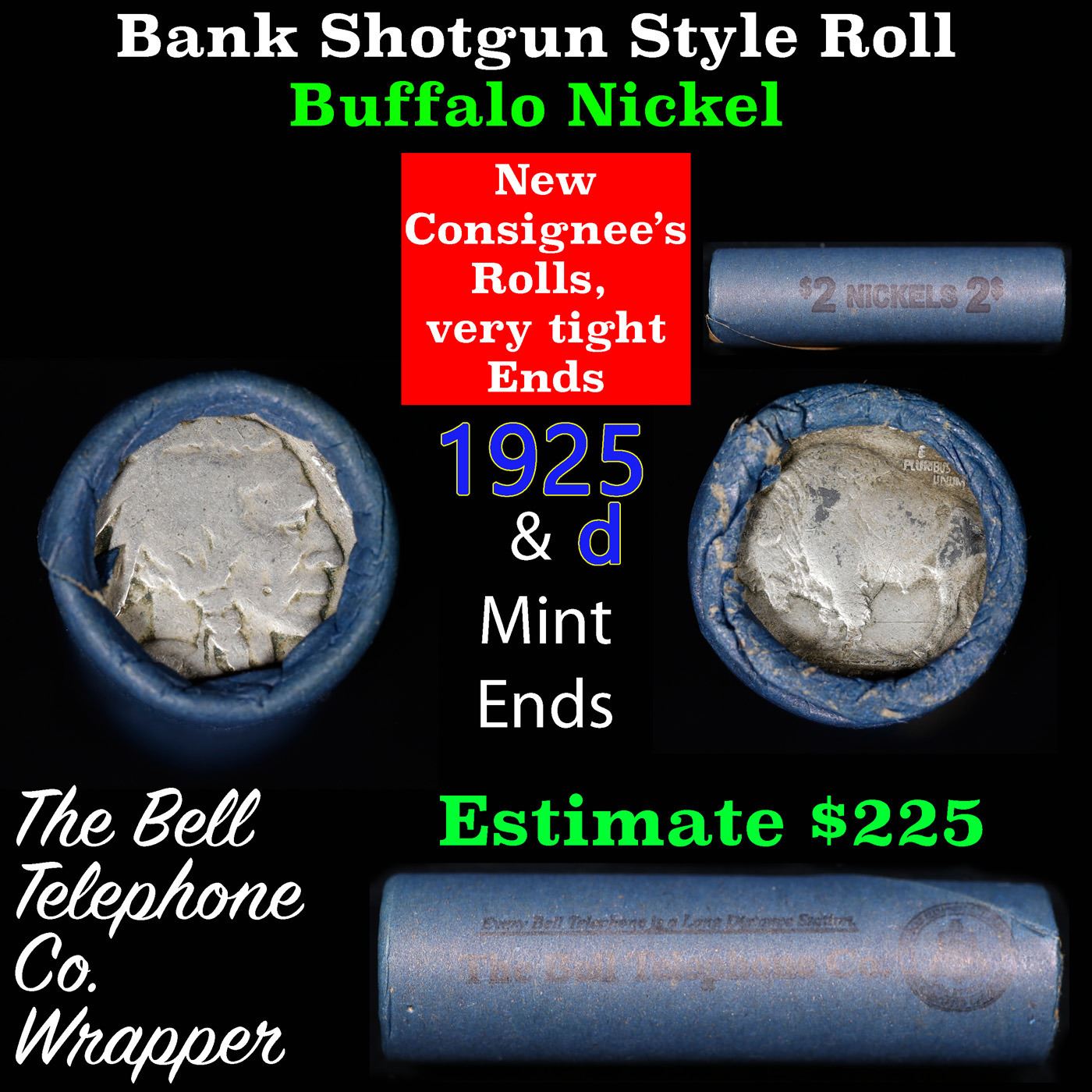 Buffalo Nickel Shotgun Roll in Old Bank Style 'Bell Telephone' Wrapper 1925 &d Mint Ends. The roll is held in an old, rare "Bell Telephone Co." Bank style wrapper. This is the Bell Telephone logo from the 1960's. They are all frrom one Estate. The ends on these rolls are very tight. We will guarantee they are all full dates.