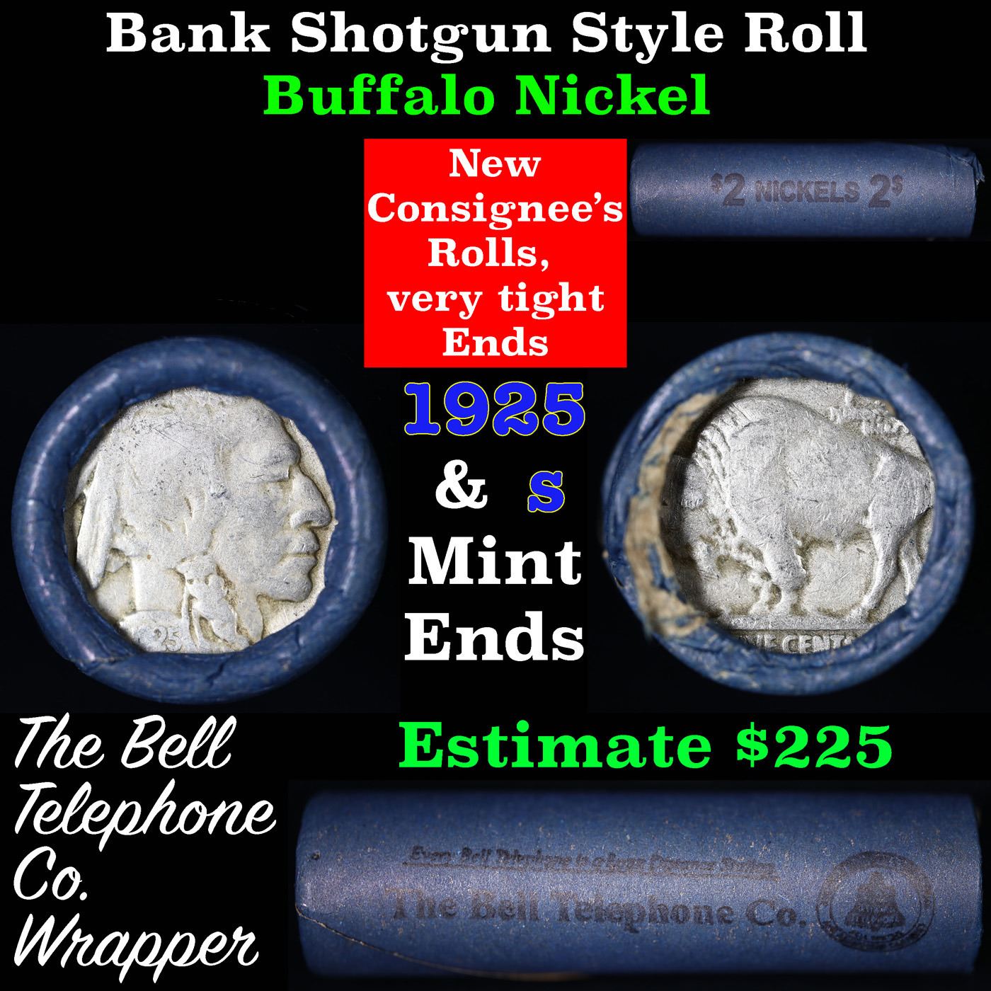 Buffalo Nickel Shotgun Roll in Old Bank Style 'Bell Telephone' Wrapper 1925 & s Mint Ends. 0 The roll is held in an old, rare "Bell Telephone Co." Bank style wrapper. This is the Bell Telephone logo from the 1960's. They are all frrom one Estate. The ends on these rolls are very tight. We will guarantee they are all full dates.