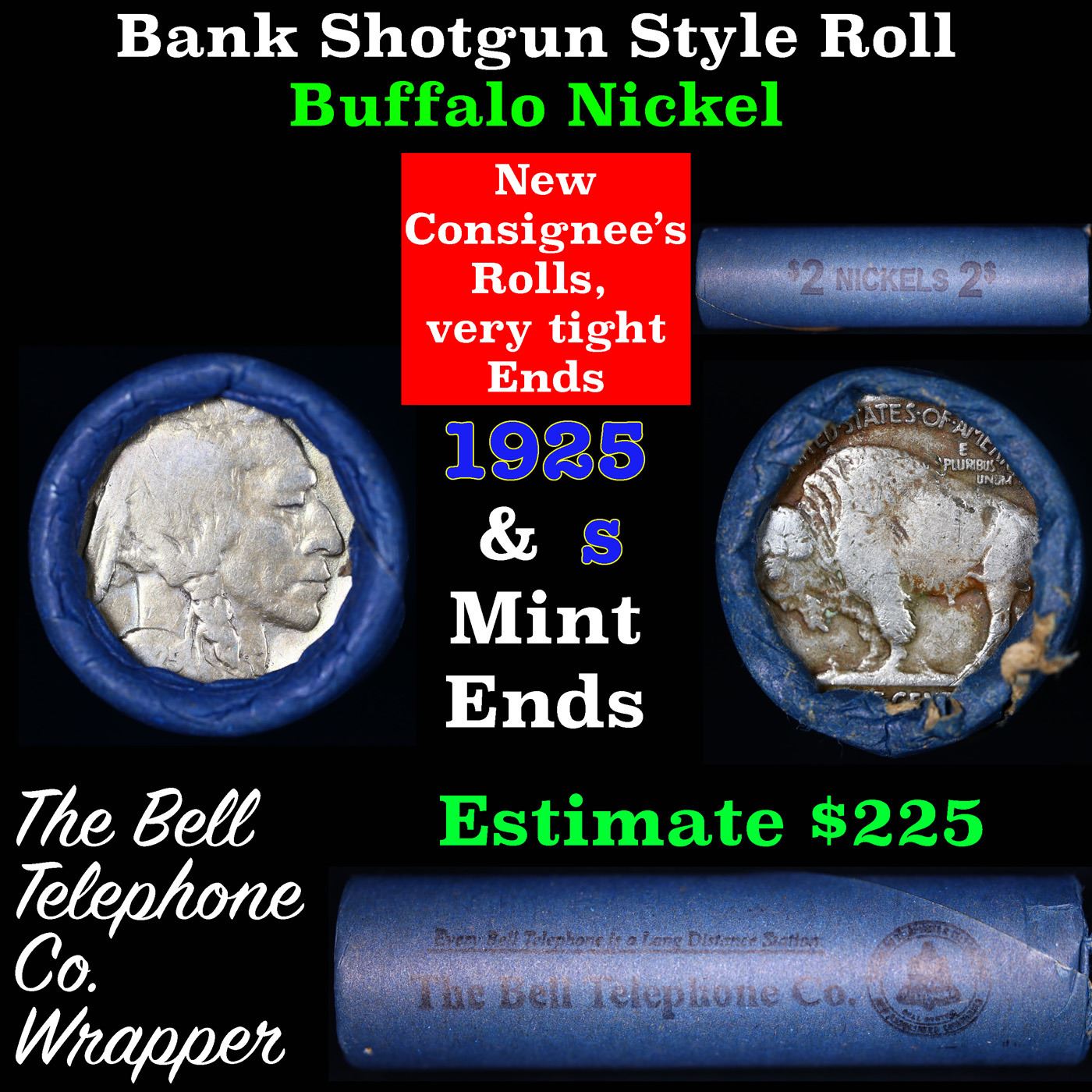 Buffalo Nickel Shotgun Roll in Old Bank Style 'Bell Telephone' Wrapper 1925 &s Mint Ends. The roll is held in an old, rare "Bell Telephone Co." Bank style wrapper. This is the Bell Telephone logo from the 1960's. They are all frrom one Estate. The ends on these rolls are very tight. We will guarantee they are all full dates.