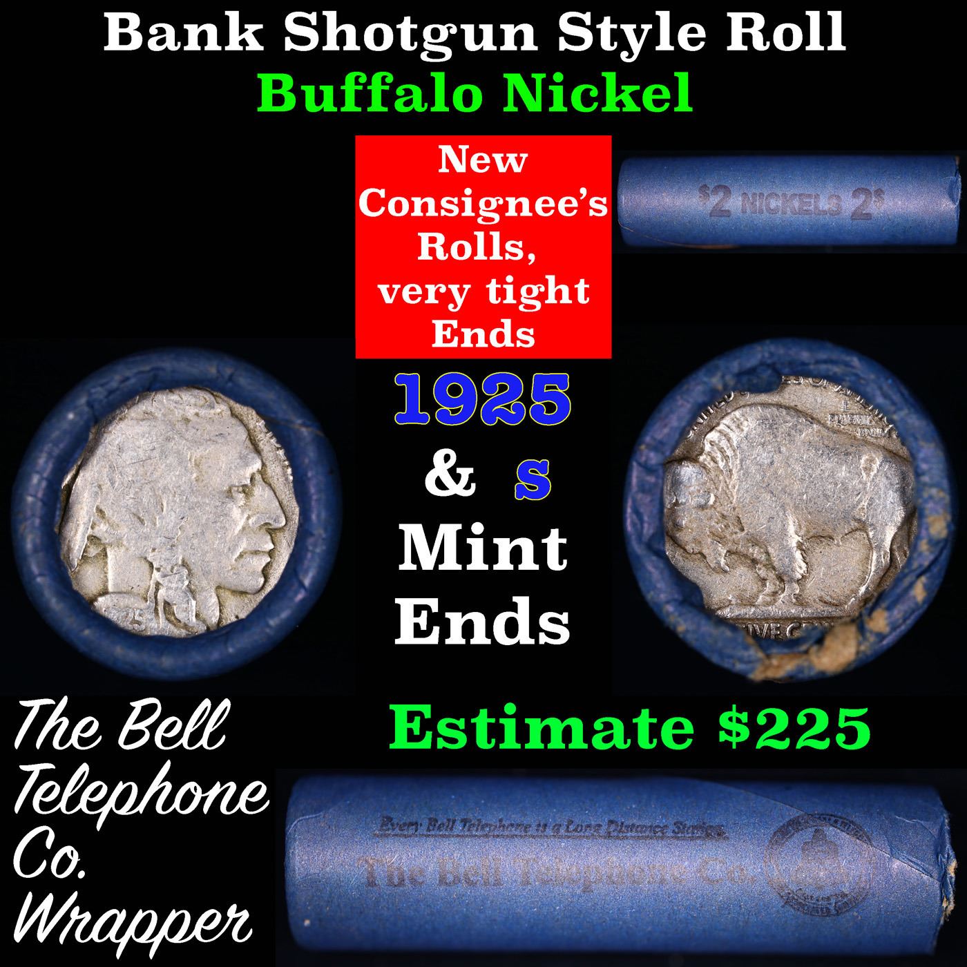 Buffalo Nickel Shotgun Roll in Old Bank Style 'Bell Telephone' Wrapper 1925 &s Mint Ends. The roll is held in an old, rare "Bell Telephone Co." Bank style wrapper. This is the Bell Telephone logo from the 1960's. They are all frrom one Estate. The ends on these rolls are very tight. We will guarantee they are all full dates.