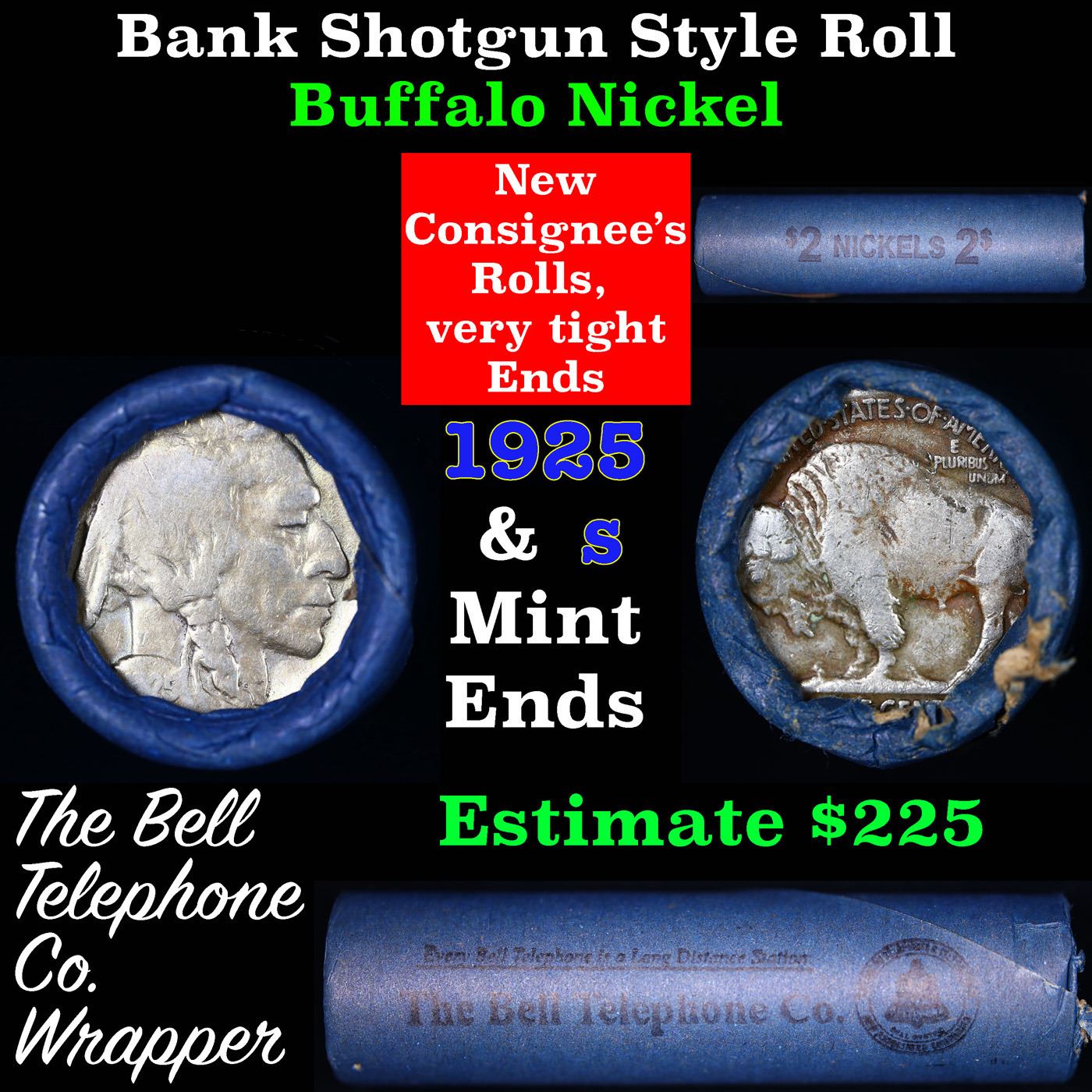 Buffalo Nickel Shotgun Roll in Old Bank Style 'Bell Telephone' Wrapper 1925 &s Mint Ends. The roll is held in an old, rare "Bell Telephone Co." Bank style wrapper. This is the Bell Telephone logo from the 1960's. They are all frrom one Estate. The ends on these rolls are very tight. We will guarantee they are all full dates.