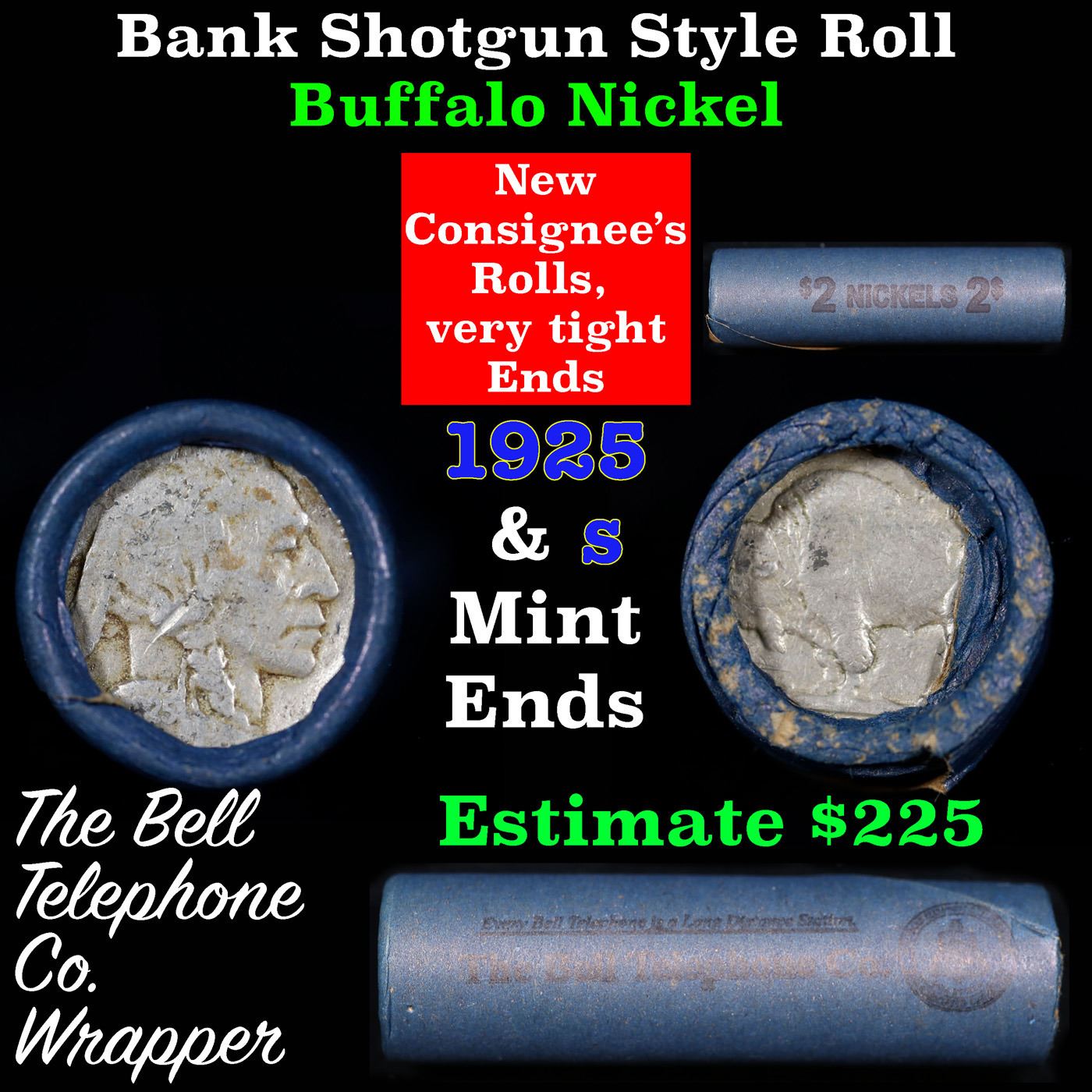Buffalo Nickel Shotgun Roll in Old Bank Style 'Bell Telephone' Wrapper 1925 & s Mint Ends. The roll is held in an old, rare "Bell Telephone Co." Bank style wrapper. This is the Bell Telephone logo from the 1960's. They are all frrom one Estate. The ends on these rolls are very tight. We will guarantee they are all full dates.