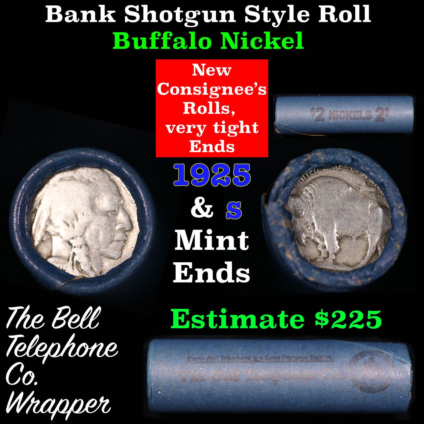 Buffalo Nickel Shotgun Roll in Old Bank Style 'Bell Telephone' Wrapper 1925 & s Mint Ends. The roll is held in an old, rare "Bell Telephone Co." Bank style wrapper. This is the Bell Telephone logo from the 1960's. They are all frrom one Estate. The ends on these rolls are very tight. We will guarantee they are all full dates.