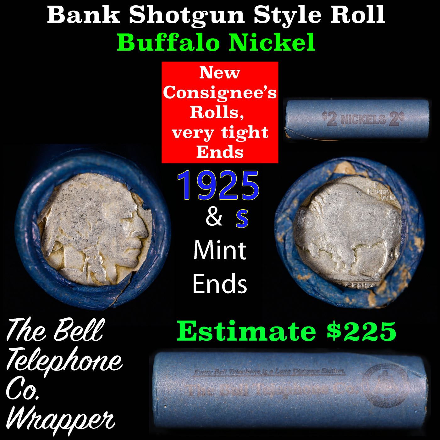 Buffalo Nickel Shotgun Roll in Old Bank Style 'Bell Telephone' Wrapper 1925 &s Mint Ends. The roll is held in an old, rare "Bell Telephone Co." Bank style wrapper. This is the Bell Telephone logo from the 1960's. They are all frrom one Estate. The ends on these rolls are very tight. We will guarantee they are all full dates.