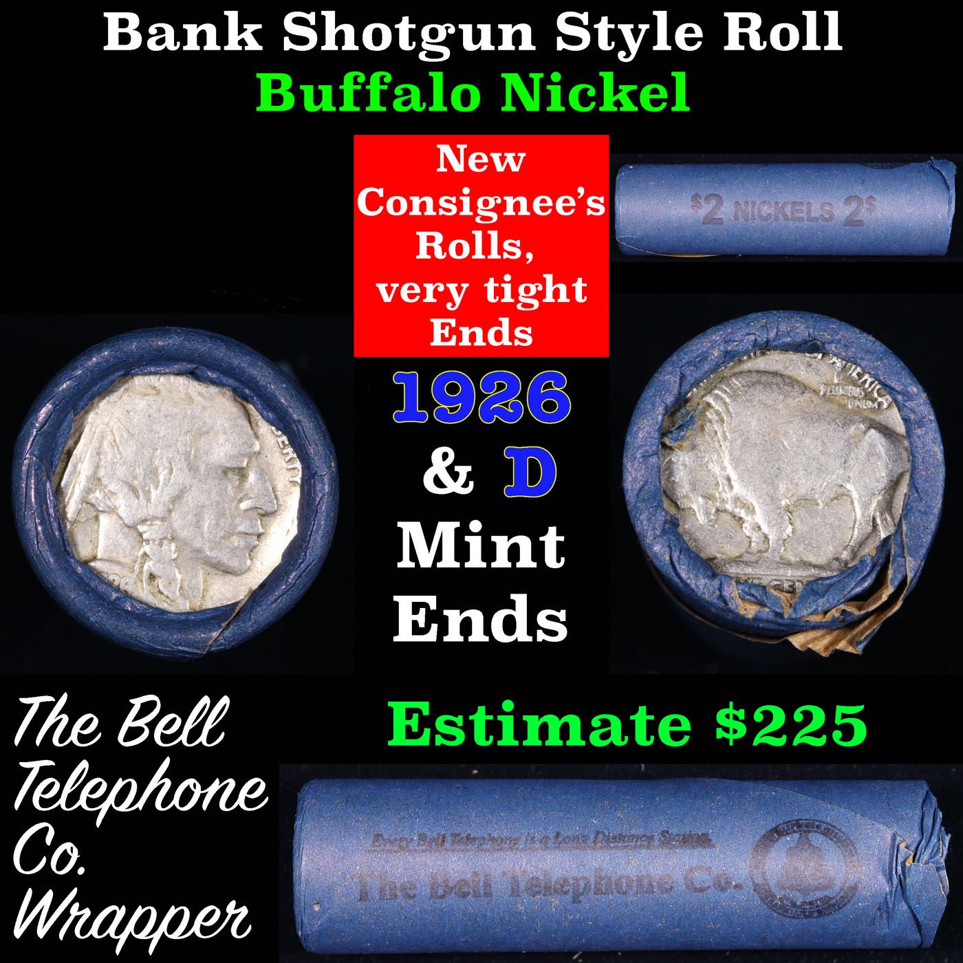 Buffalo Nickel Shotgun Roll in Old Bank Style 'Bell Telephone' Wrapper 1926 & D Mint Ends. The roll is held in an old, rare "Bell Telephone Co." Bank style wrapper. This is the Bell Telephone logo from the 1960's. They are all frrom one Estate. The ends on these rolls are very tight. We will guarantee they are all full dates.