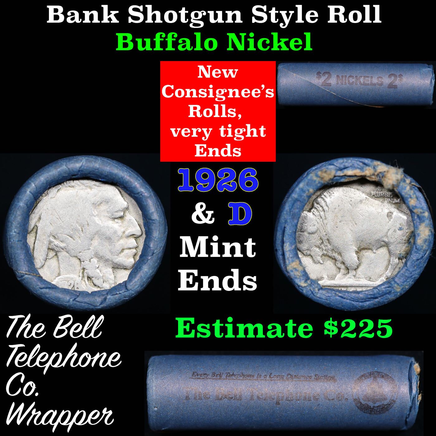 Buffalo Nickel Shotgun Roll in Old Bank Style 'Bell Telephone' Wrapper 1926 & D Mint Ends. The roll is held in an old, rare "Bell Telephone Co." Bank style wrapper. This is the Bell Telephone logo from the 1960's. They are all frrom one Estate. The ends on these rolls are very tight. We will guarantee they are all full dates.