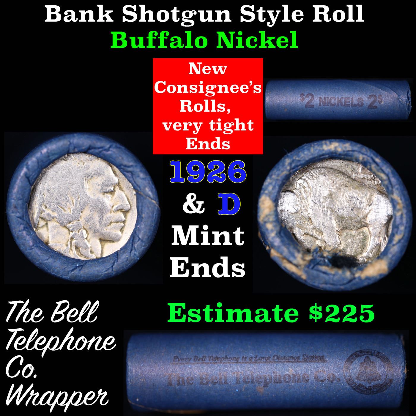Buffalo Nickel Shotgun Roll in Old Bank Style 'Bell Telephone' Wrapper 1926 & D Mint Ends. The roll is held in an old, rare "Bell Telephone Co." Bank style wrapper. This is the Bell Telephone logo from the 1960's. They are all frrom one Estate. The ends on these rolls are very tight. We will guarantee they are all full dates.