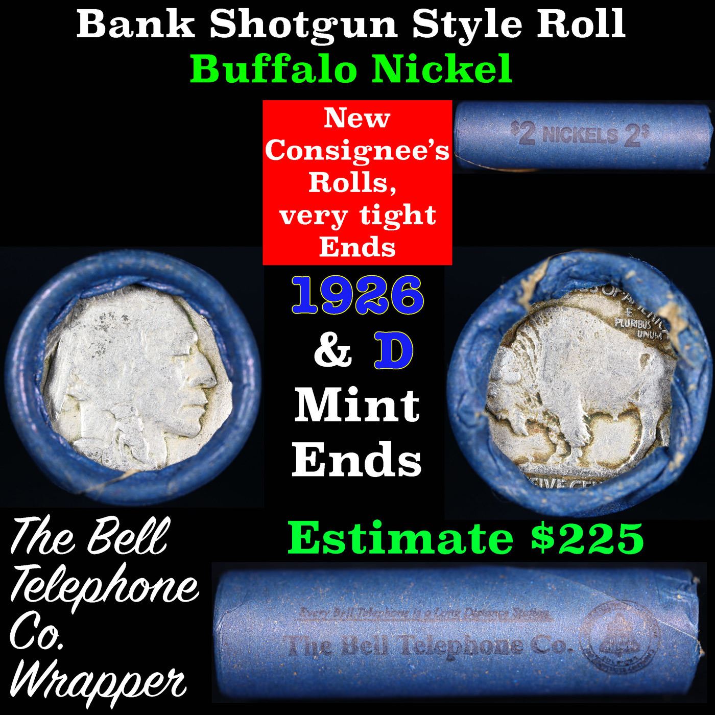 Buffalo Nickel Shotgun Roll in Old Bank Style 'Bell Telephone' Wrapper 1926 & D Mint Ends. The roll is held in an old, rare "Bell Telephone Co." Bank style wrapper. This is the Bell Telephone logo from the 1960's. They are all frrom one Estate. The ends on these rolls are very tight. We will guarantee they are all full dates.
