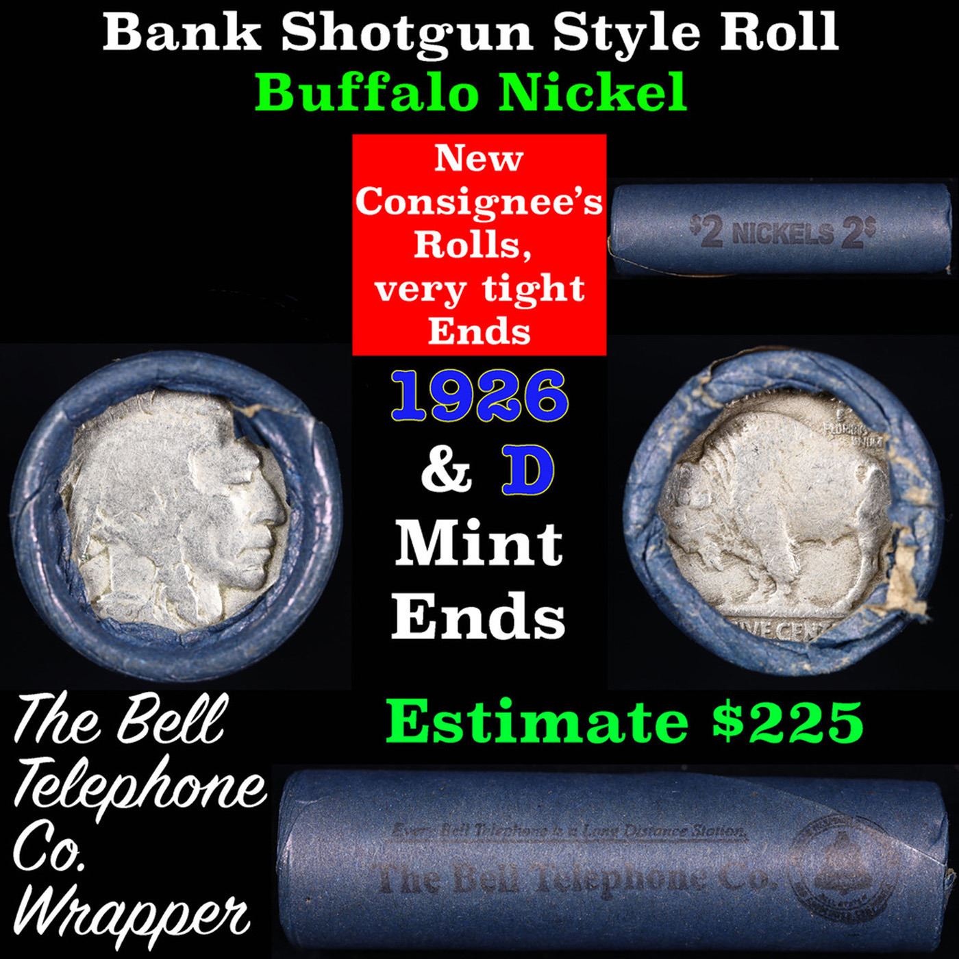 Buffalo Nickel Shotgun Roll in Old Bank Style 'Bell Telephone' Wrapper 1926 & D Mint Ends. The roll is held in an old, rare "Bell Telephone Co." Bank style wrapper. This is the Bell Telephone logo from the 1960's. They are all frrom one Estate. The ends on these rolls are very tight. We will guarantee they are all full dates.