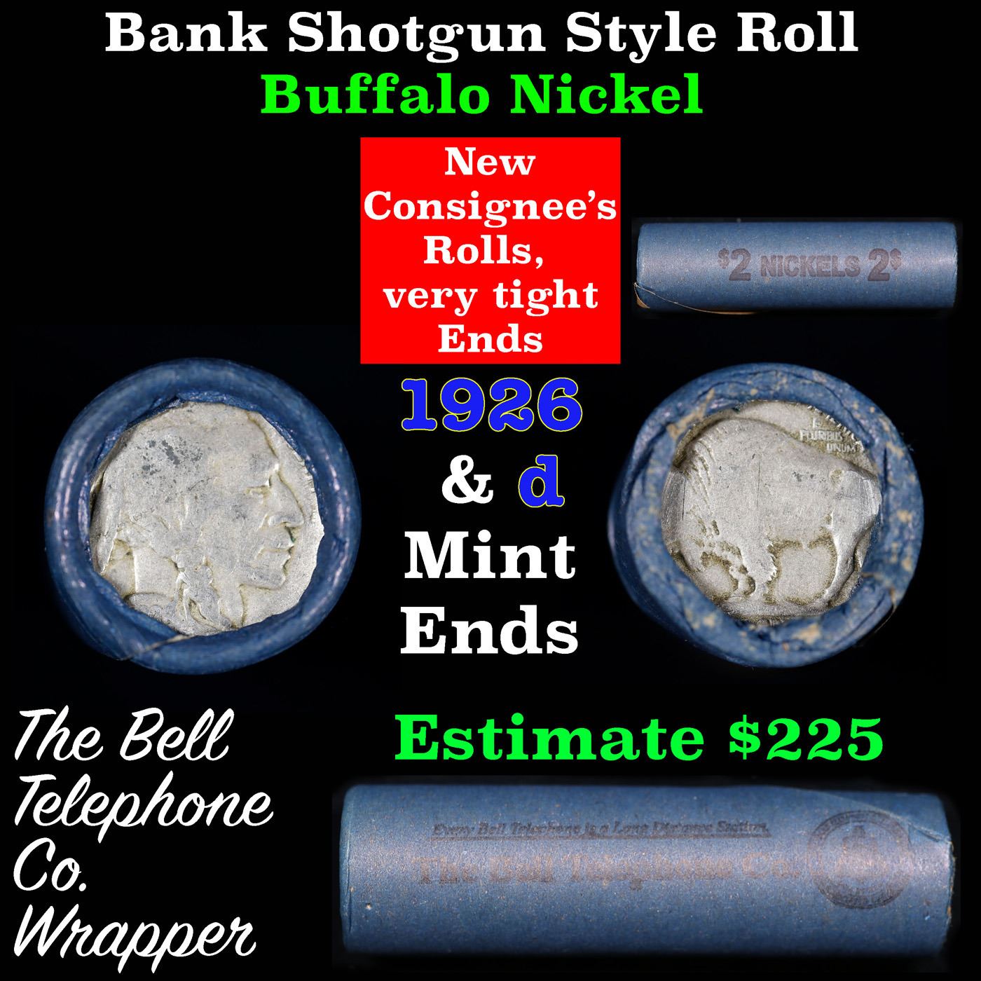 Buffalo Nickel Shotgun Roll in Old Bank Style 'Bell Telephone' Wrapper 1926 & D Mint Ends. The roll is held in an old, rare "Bell Telephone Co." Bank style wrapper. This is the Bell Telephone logo from the 1960's. They are all frrom one Estate. The ends on these rolls are very tight. We will guarantee they are all full dates.